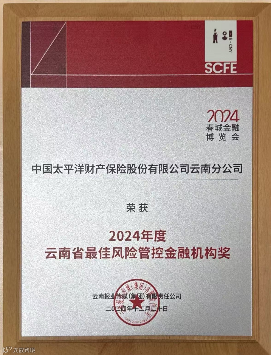 12月20日,在云南日报报业集团主办的“金融新力量——2024第十四届春城金融博览会”上,中国太保产险云南分公司荣获“2024年度云南省最佳风险管控金融机构”奖,该奖项旨在表彰2024年以来云南省内风险管控工作突出金融机构。