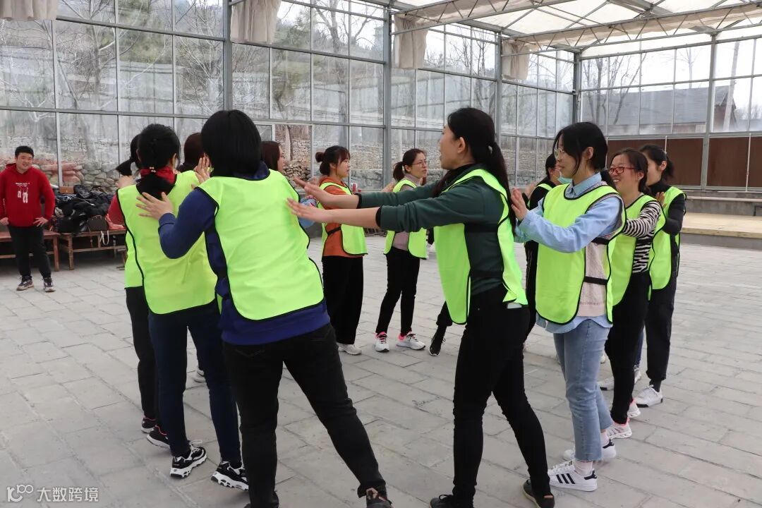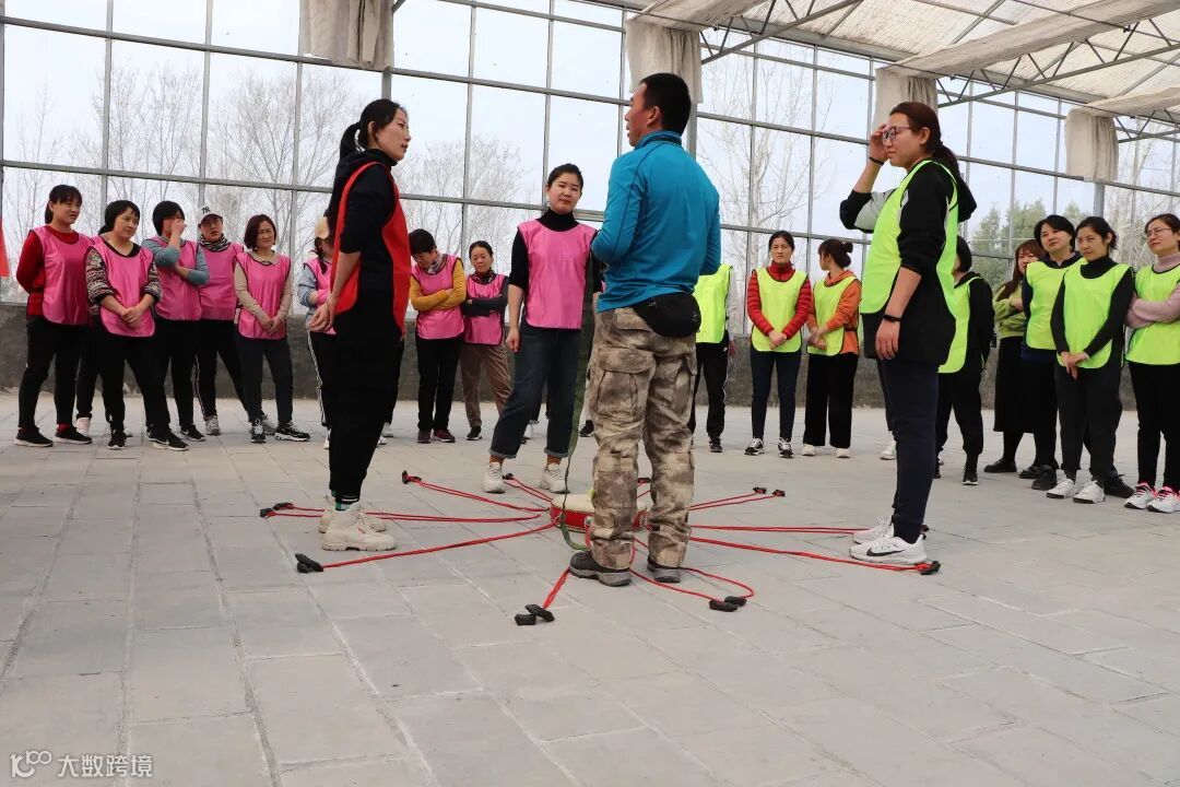 在教练的指导下,公司女职工们通过小游戏进行热身准备活动。