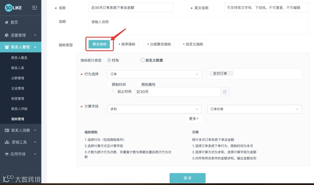 6)点击保存,近30天订单系统下单总金额的聚合指标创建完毕
