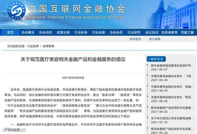 6月初,中国互联网金融协会也发文倡议规范医疗美容相关金融产品和金融服务,要求金融机构不与任何不法医疗美容机构开展合作,不向任何不法医疗美容机构客户提供相关金融产品和服务。