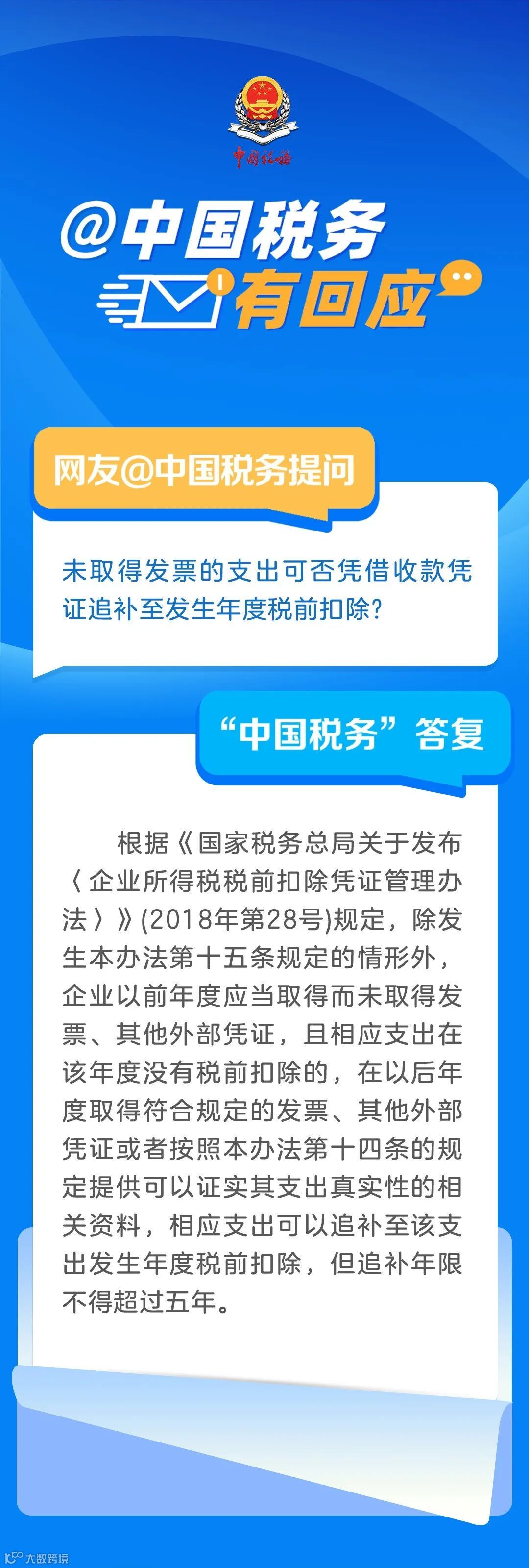 @中国税务有回应:未取得发票的支出可否凭借收款凭证追补至发生年度税前扣除