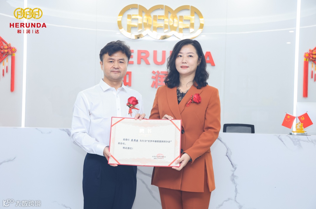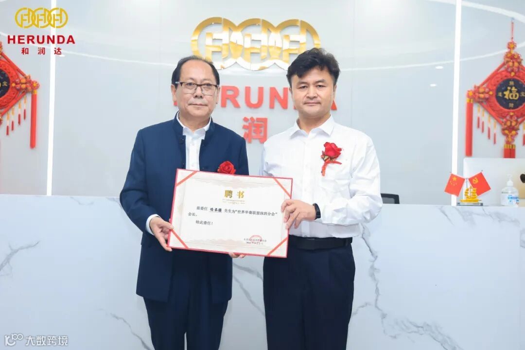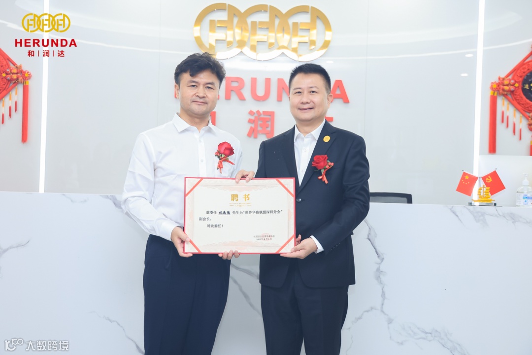 致辞后,主席郭绍成为深圳分会会长(世界华裔联盟副秘书长)冯丞疆、常务会长(深圳和润达科技有限公司董事长)李东升颁发聘书。