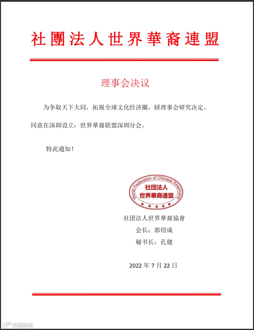 经世界华裔联盟决定:为争取天下大同,拓展全球华裔文化经济圈,深圳特别设立世界华裔联盟分会。