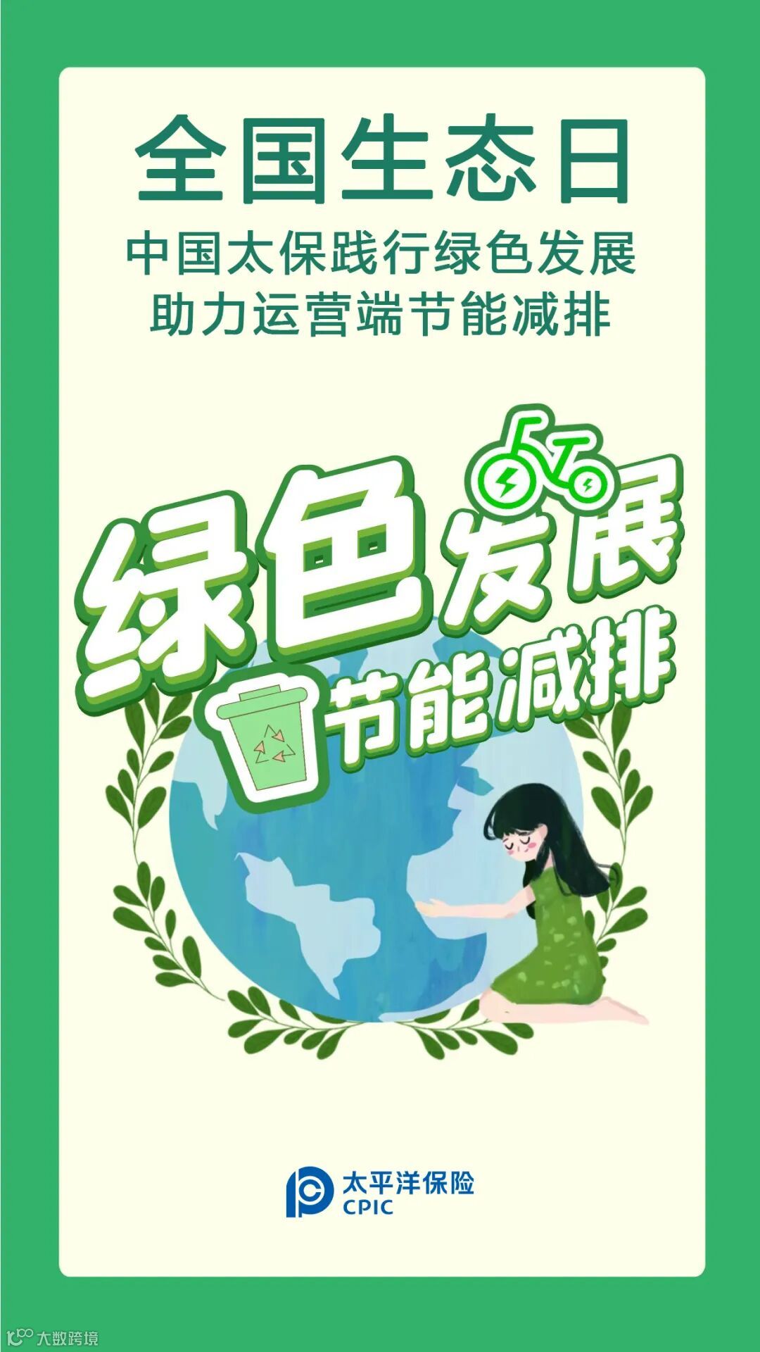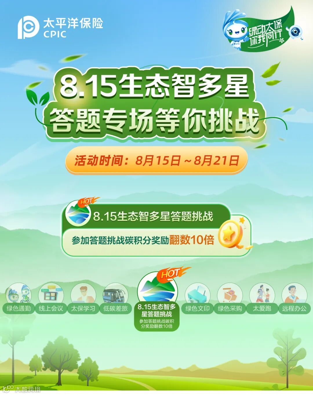 8月15日是全国生态日。为深入贯彻国家生态文明理念,增强低碳环保意识,推广绿色办公,中国太保正在开展“绿动太保,你我同行”生态日主题活动。在员工碳积分平台“碳险家”开展“全国生态日知识大闯关活动”;在主要职场开展绿色出行、绿色办公等低碳行为倡议活动。
