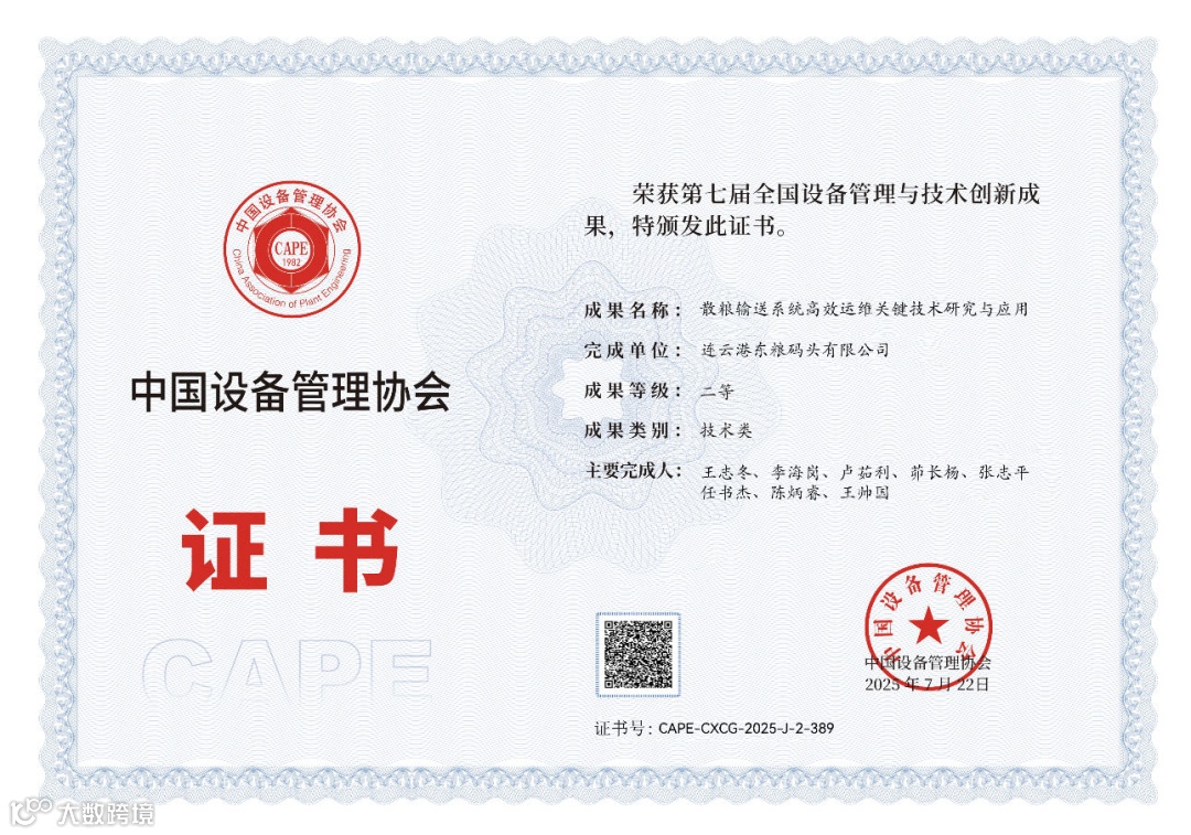 近日,从中国设备管理协会主办的第七届全国设备管理与技术创新成果交流大会上传来喜讯,东粮公司申报的“散粮输送系统高效运维关键技术研究与应用”成果荣获第七届全国设备管理与技术创新成果(技术类)二等奖。