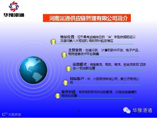 华豫港通“华豫港通”智能物流平台已经逆袭我们很久了,可能有些小伙伴们还不是很了解“华豫港通”,下面17张PPT带你全面具体了解他,让你对他不再陌生。