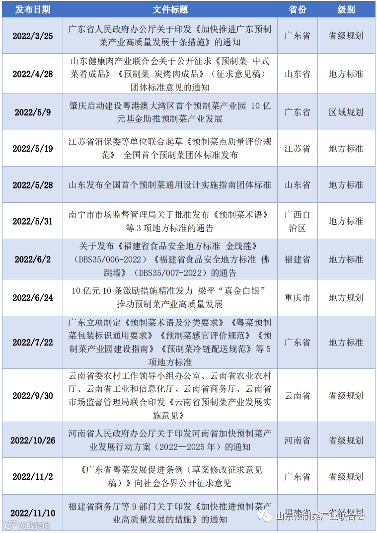 围绕预制菜,山东多个地市纷纷制定行动计划和产业政策。2022年4月,潍坊出台《潍坊市预制菜产业高质量发展三年行动计划(2022—2024)》和《潍坊市支持预制菜产业高质量发展九条政策措施》;2022年6月,德州印发《关于加快推进预制菜产业发展的若干措施》;2022年6月,淄博出台《淄博市预制食品产业发展规划》。