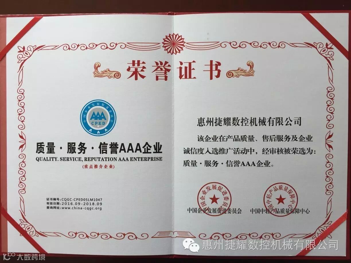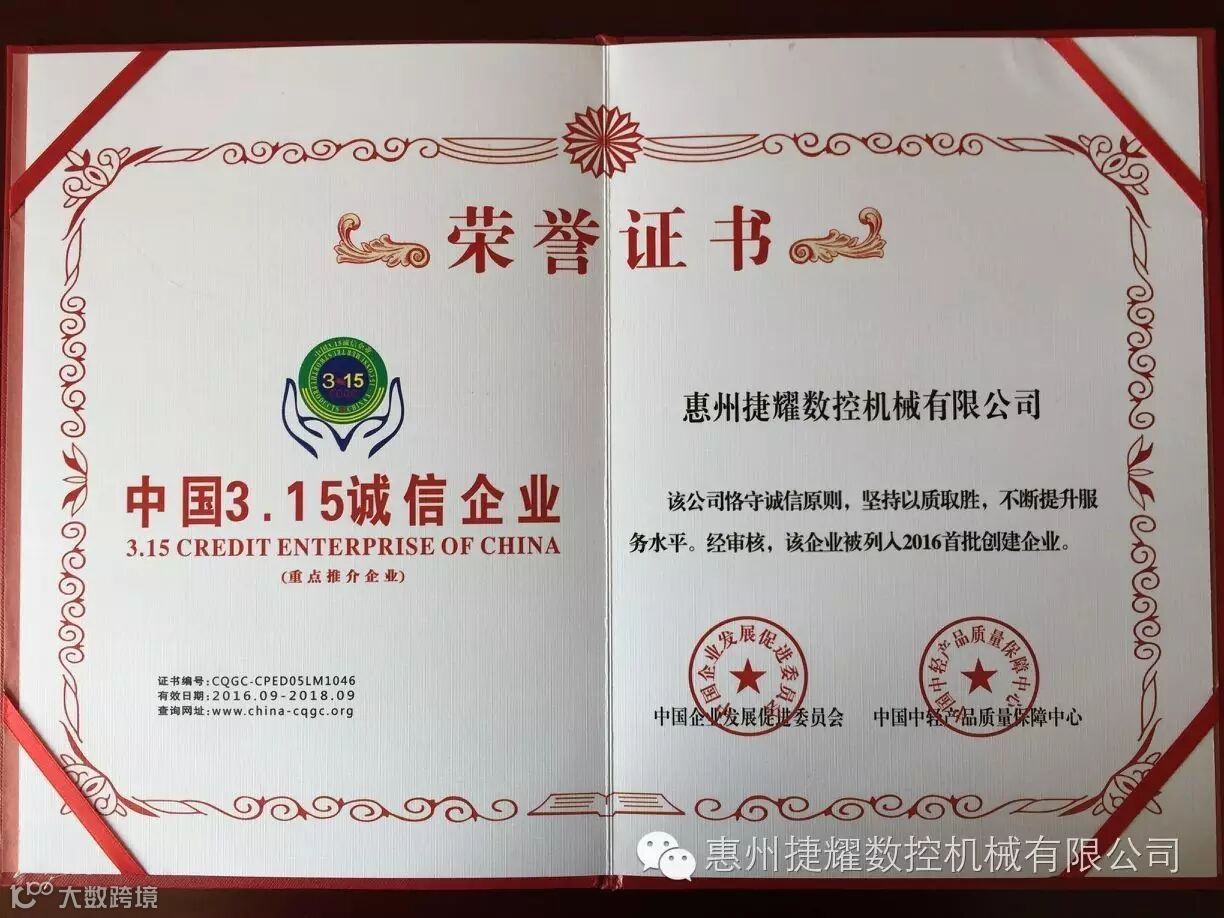 祝贺惠州捷耀数控机械有限公司荣获各项荣誉证书!