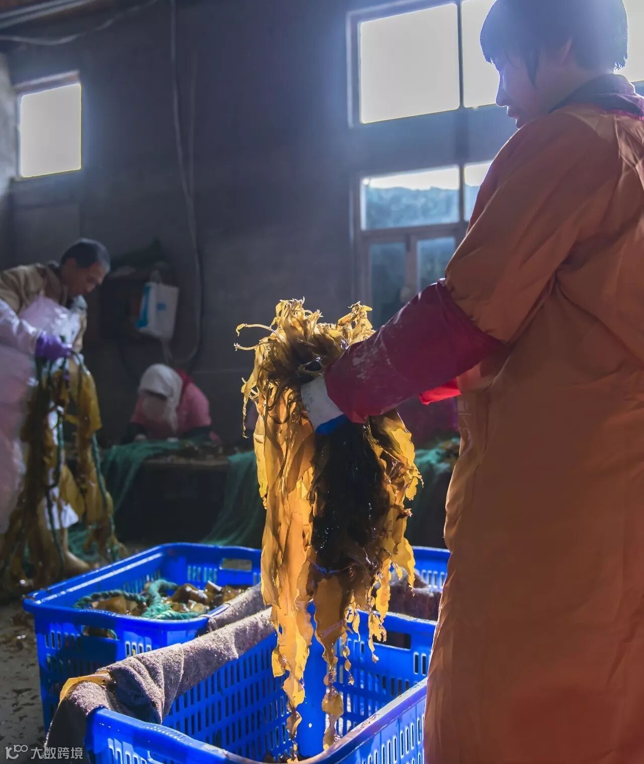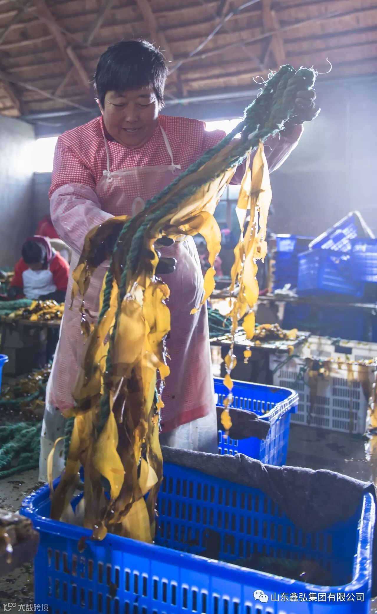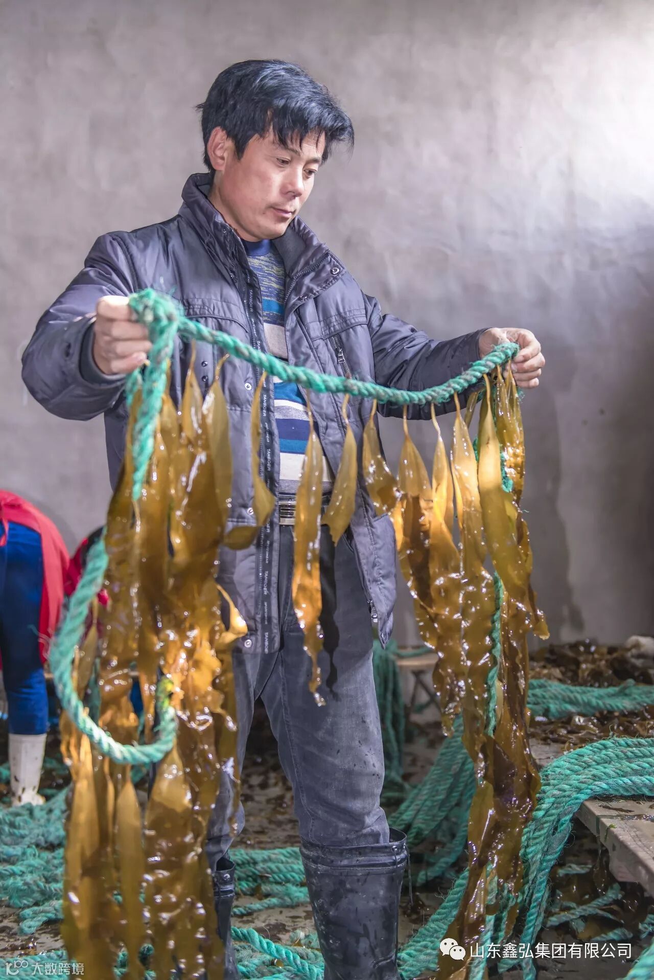 工人们熟练地将绳子拧开,把海带根夹到绳中。