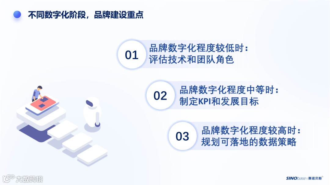 虽然品牌数字化程度低的企业,也可以保持日常运营,但聪明的营销人员,可以站在更长远的角度,看到数字化为企业带来的更多增长机会。Lopez根据企业在品牌数字化不同阶段的具体状况,提出三项工作重点建议。