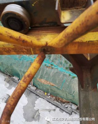 塔机因基础长期浸泡在水中致使材料和焊缝严重锈蚀,再或因焊缝表面因油漆覆盖,从而导致工作中不能及时发现,最终致使主材断裂及焊缝撕裂造成塔吊倒塌事故。