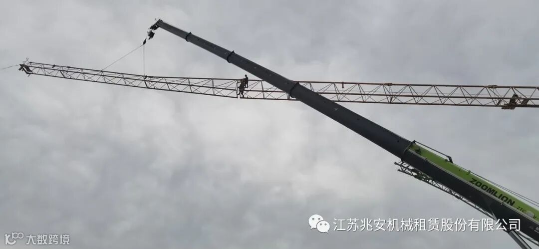 (3)安装平衡臂及拉杆,在平衡臂吊装之前,严禁将装置在平衡臂上的所有部件一次性全部安装到位,正确做法应将护栏、电气拉线等装到位,后安装其它配件,安装过程中应随时注意平衡性,严禁先装配重。