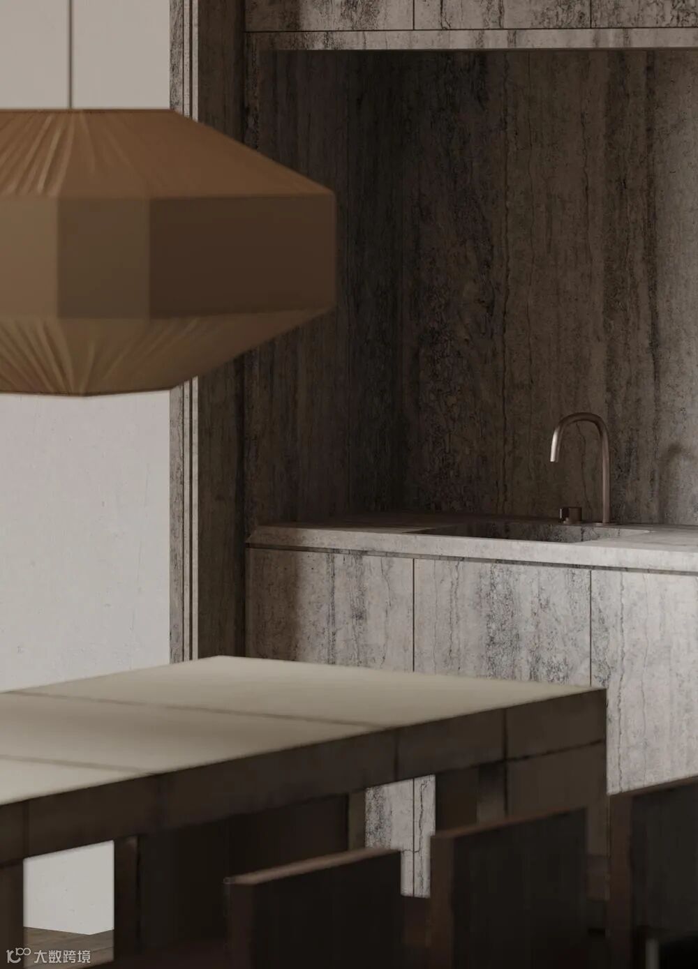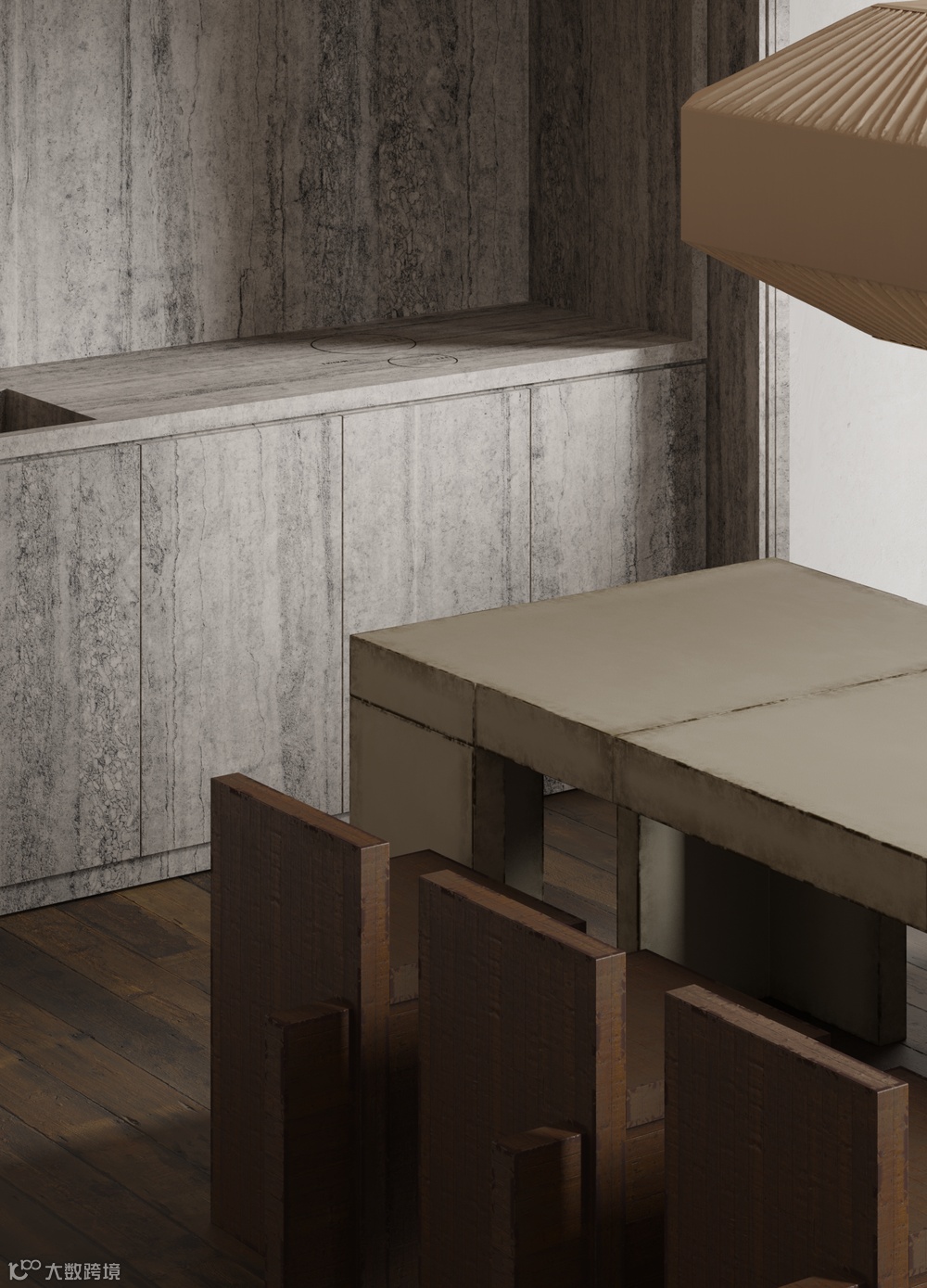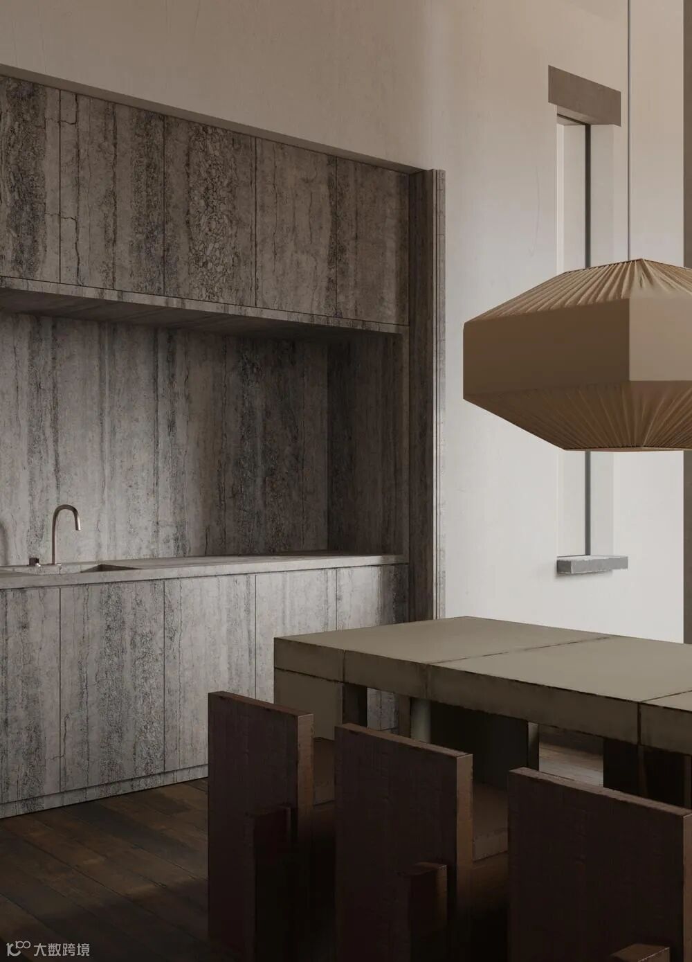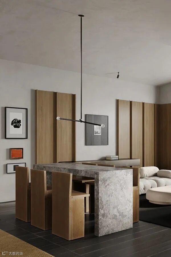 厨房餐厅一体化设计,巨大的灯饰与粗犷的餐椅,橱柜与墙面,地面采用同一材料,简洁而统一。