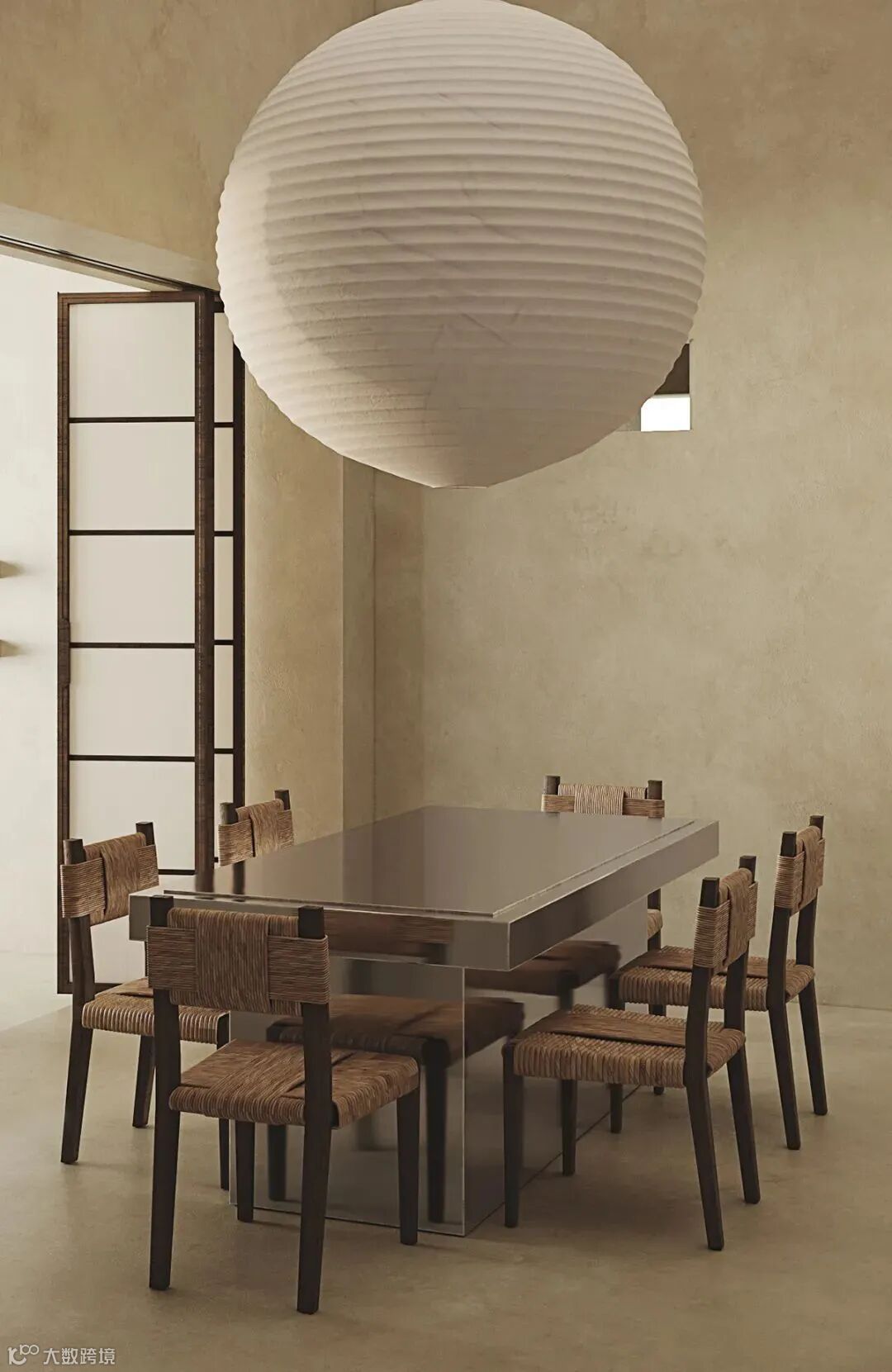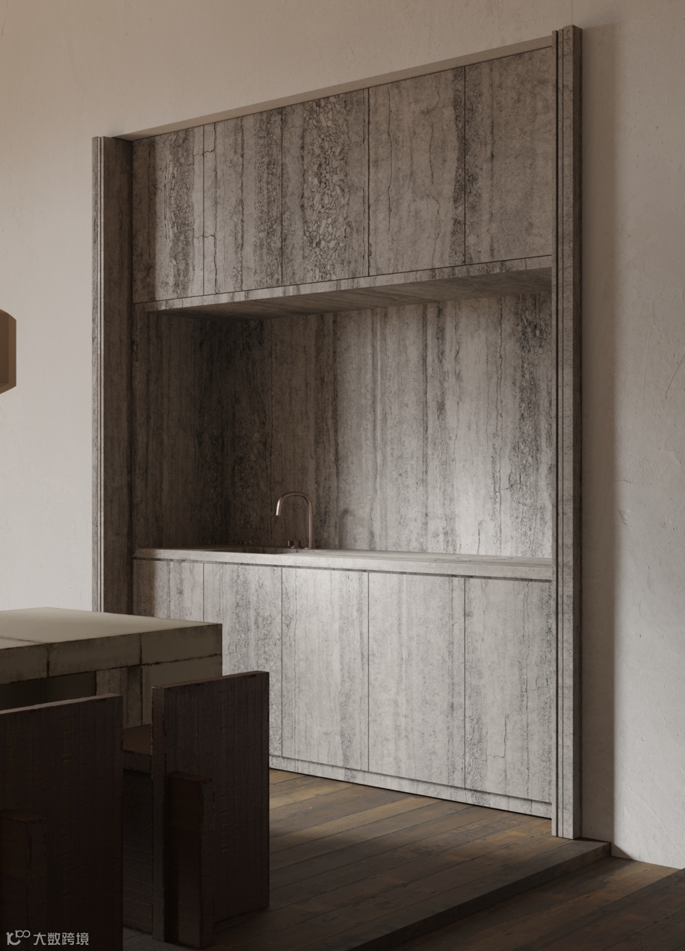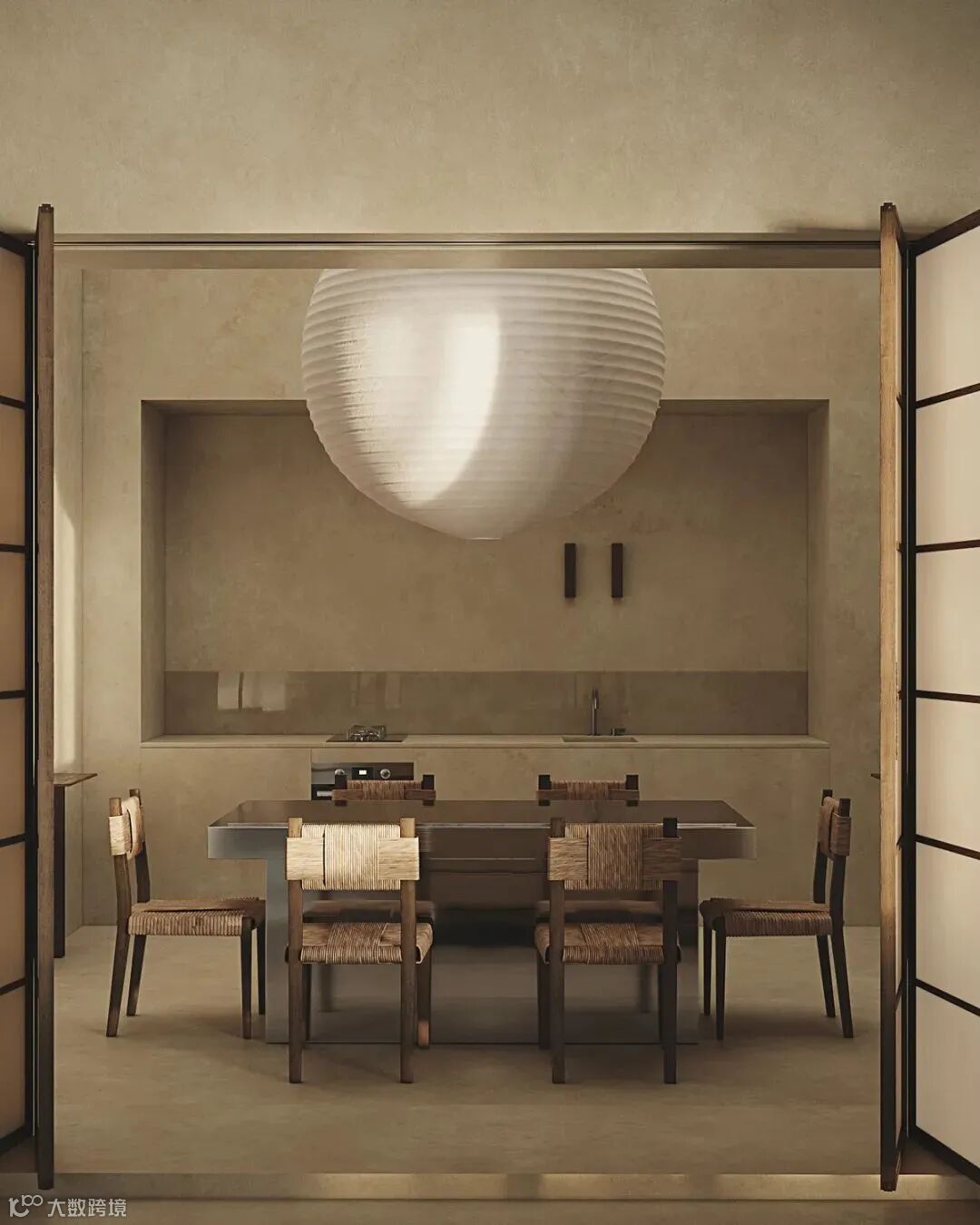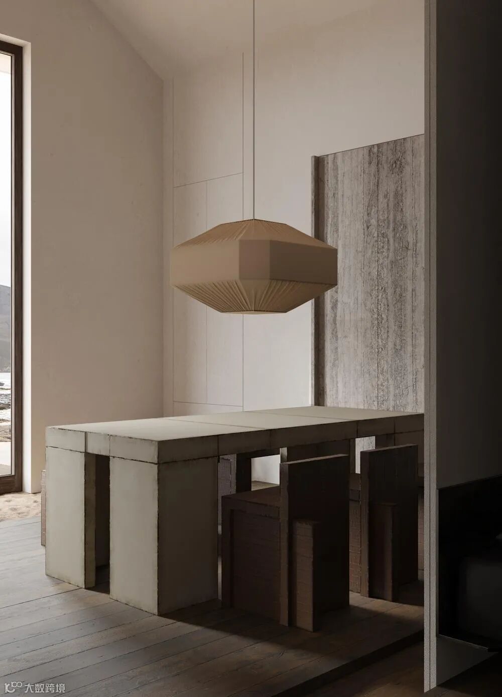 厨房餐厅一体化设计,巨大的灯饰与粗犷的餐椅,橱柜与墙面,地面采用同一材料,简洁而统一。