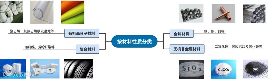 从材料本身性质,可将其分为四大类,分别是金属材料(如钢、铁、镁合金等),无机非金属材料(如二氧化硅、碳化硅、氮化镓等),有机高分子材料(聚乙烯、聚氯乙烯、顺丁橡胶等)以及复合材料(碳纤维、芳纶纤维等)。