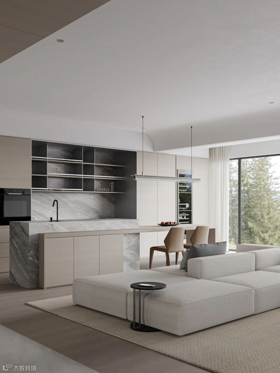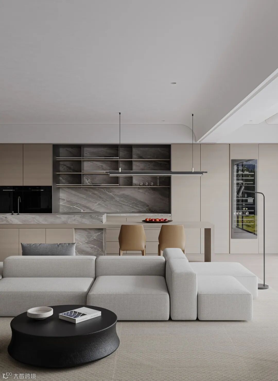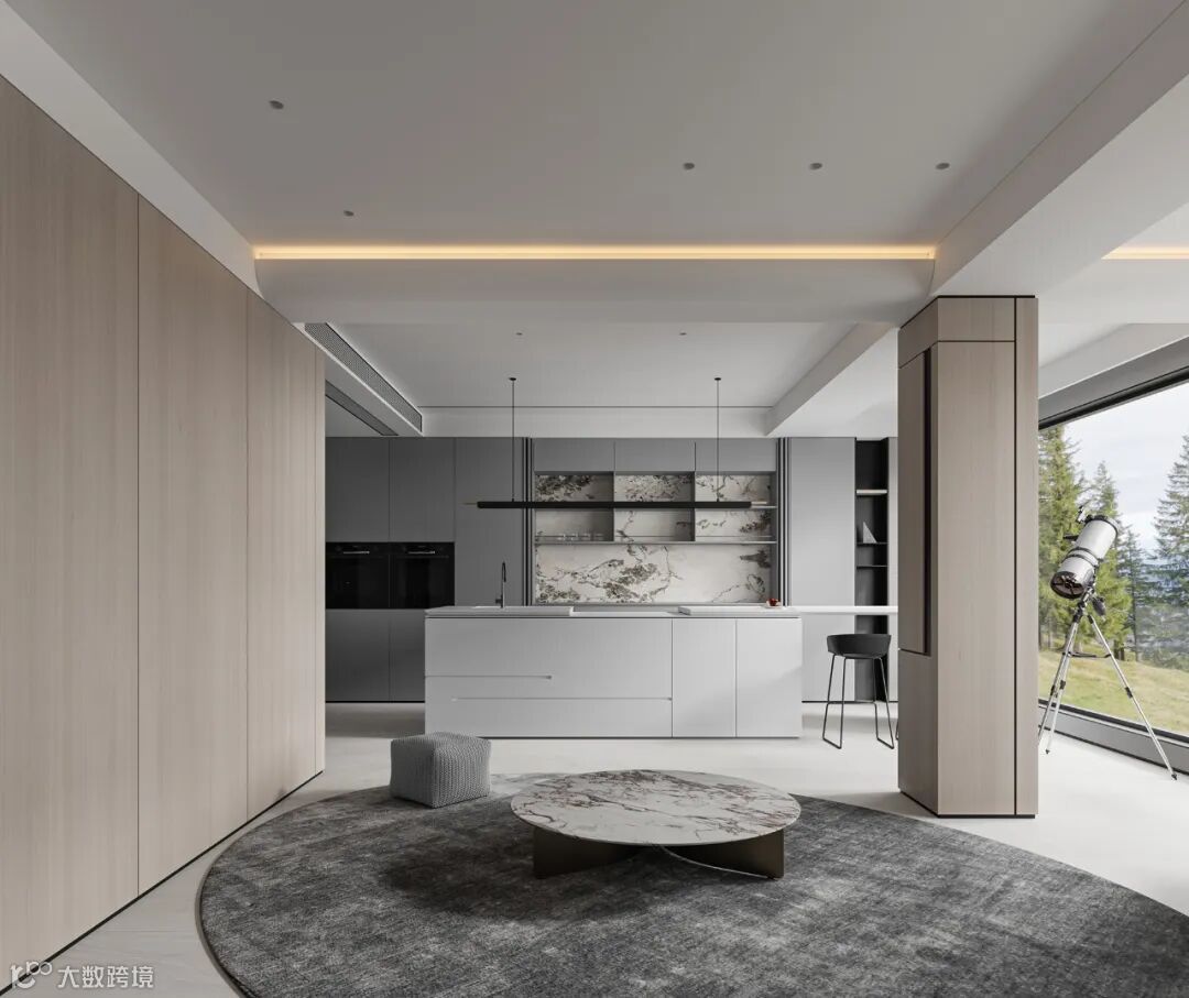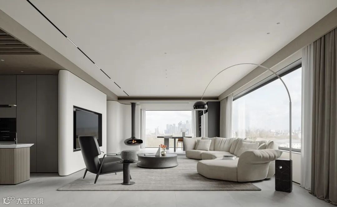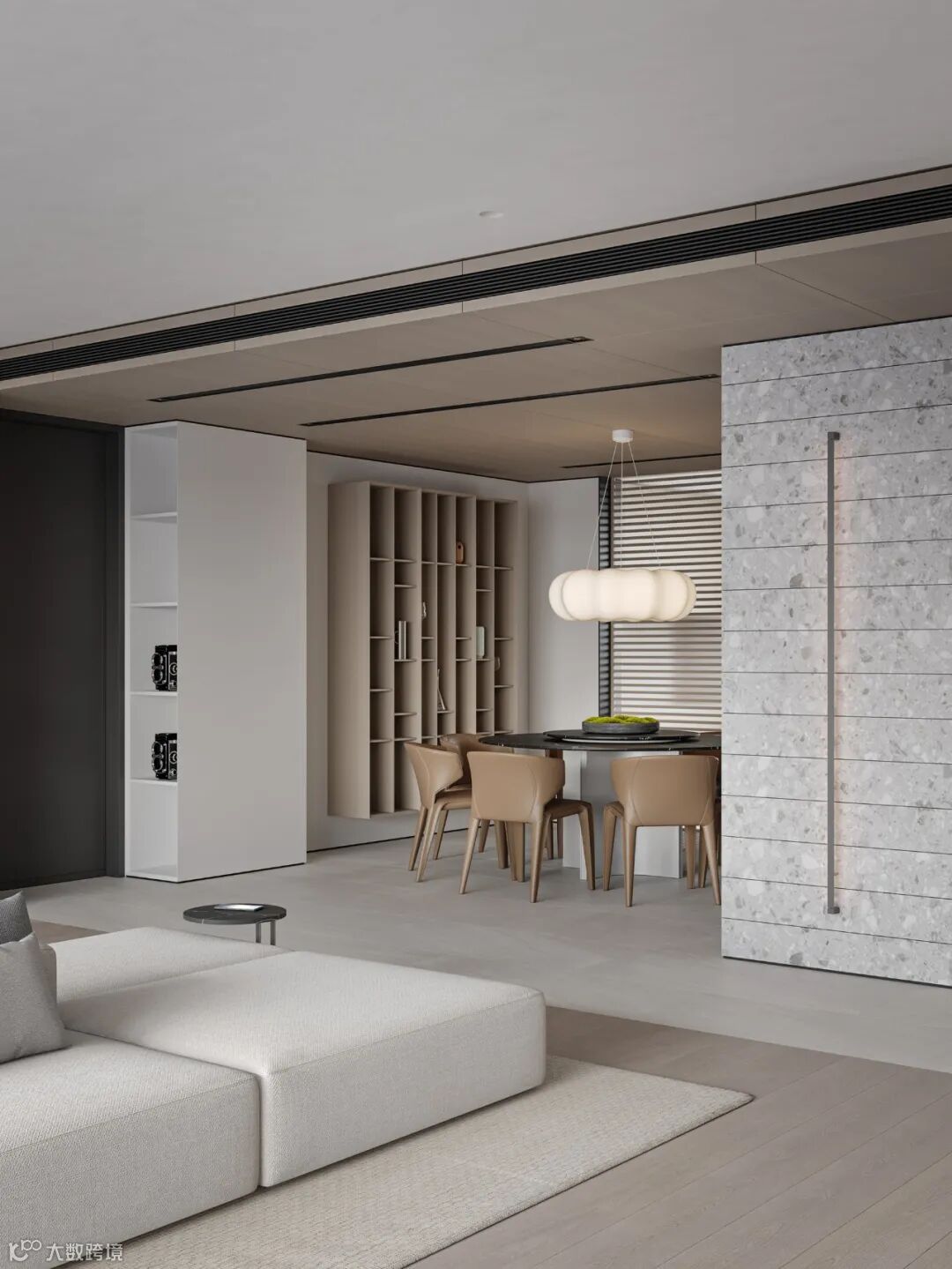 本案依然为梦太初为设计师葛赫完成表现的作品,一处大平层项目,大面积乳白色,配以少量浅色原木,定制化家具,和谐大气,而富有变化。