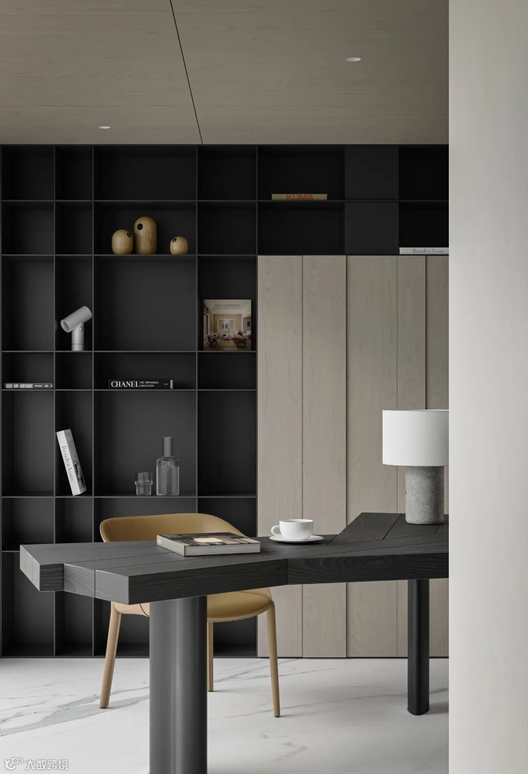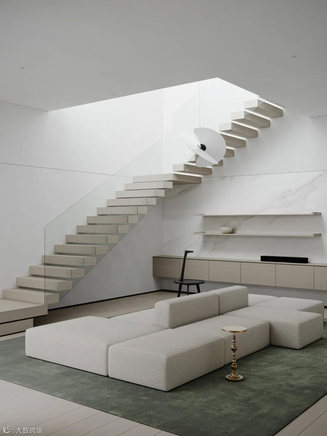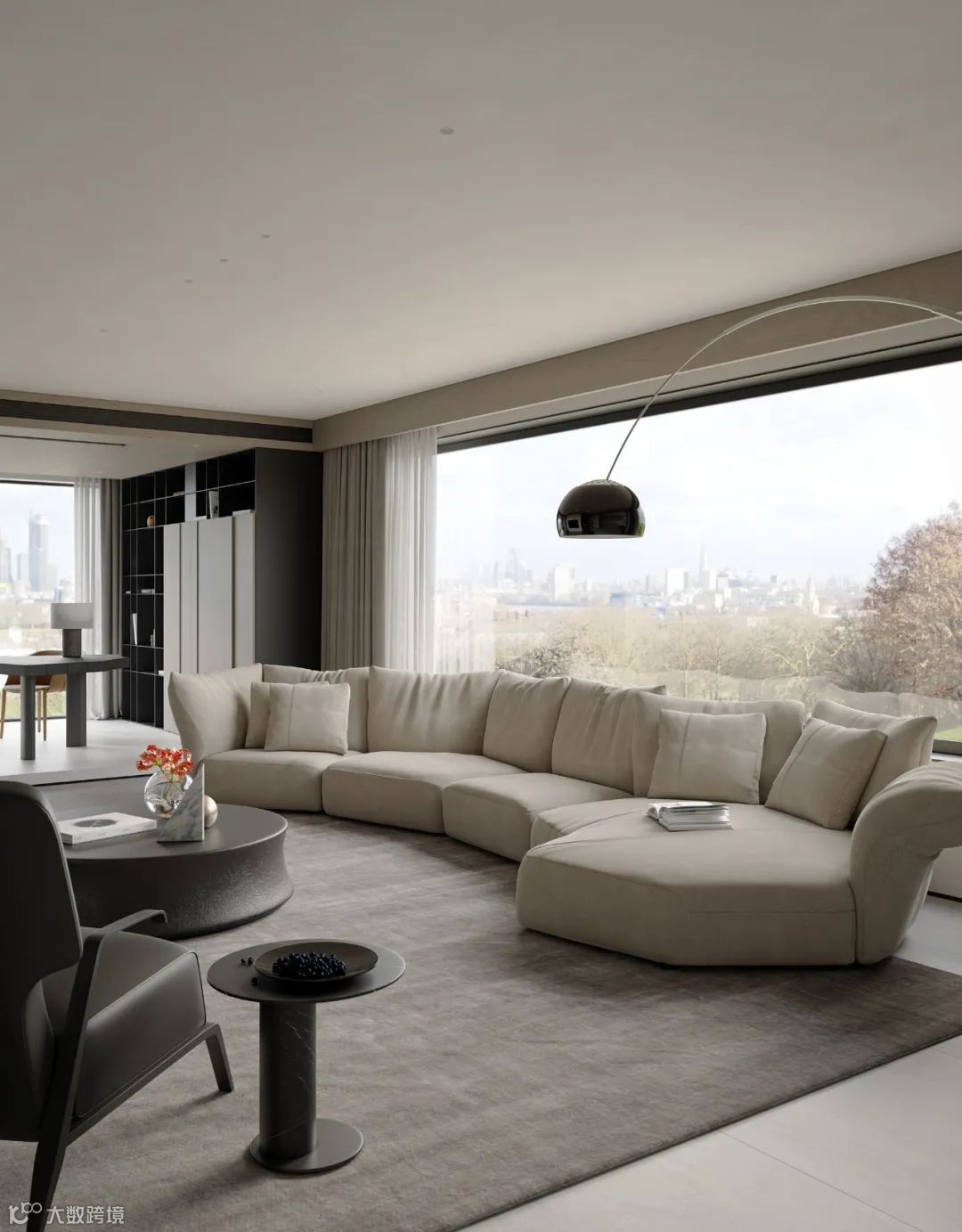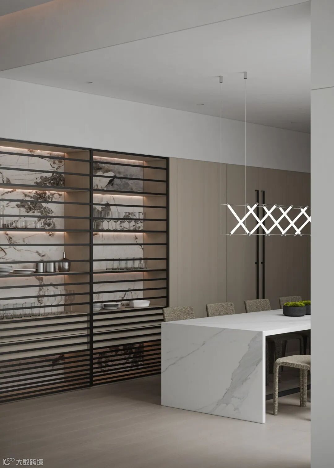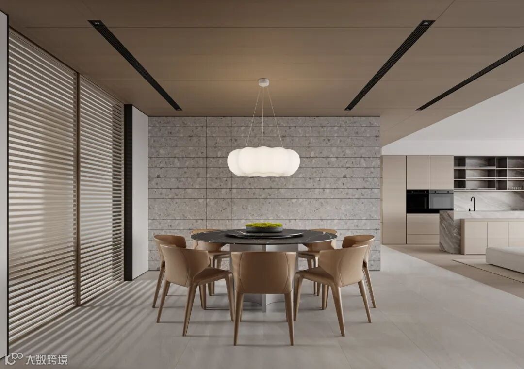 本案依然为梦太初为设计师葛赫完成表现的作品,一处大平层项目,大面积乳白色,配以少量浅色原木,定制化家具,和谐大气,而富有变化。