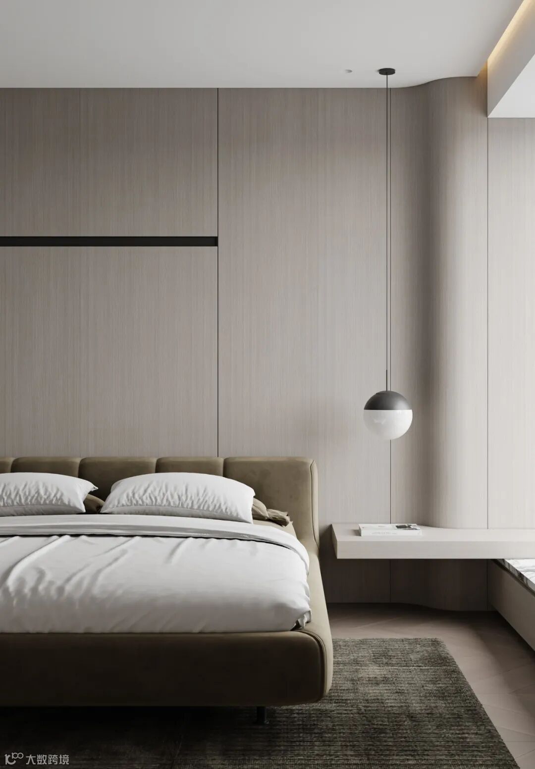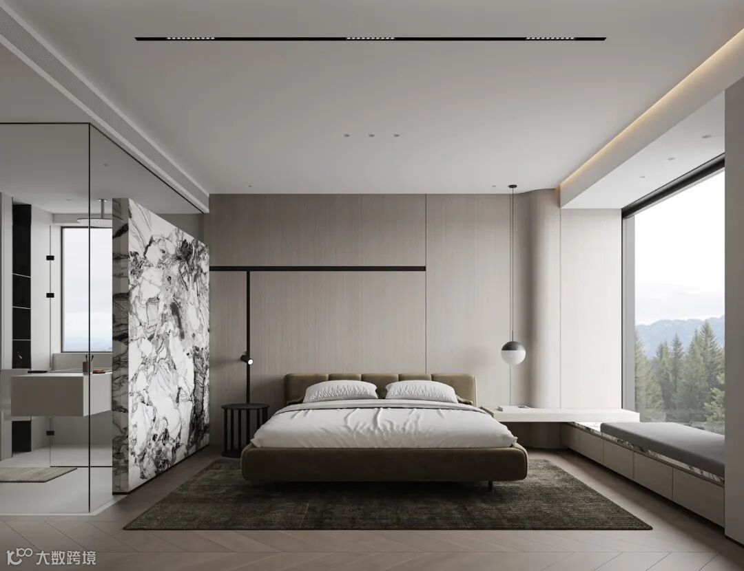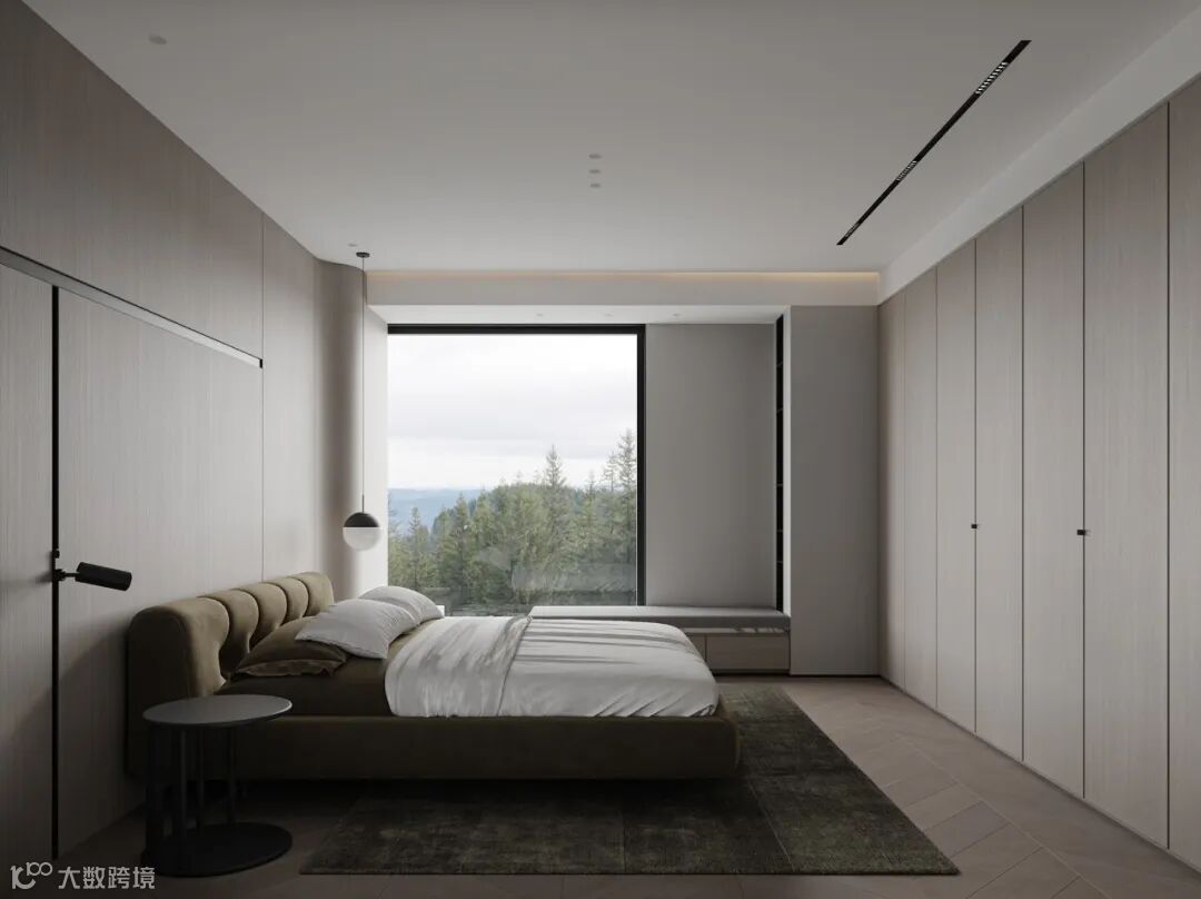 卧室设计沿用整个设计基调,增加了木饰面的面积,辅以柔和的床品与布艺,让这里更能静心和休息。