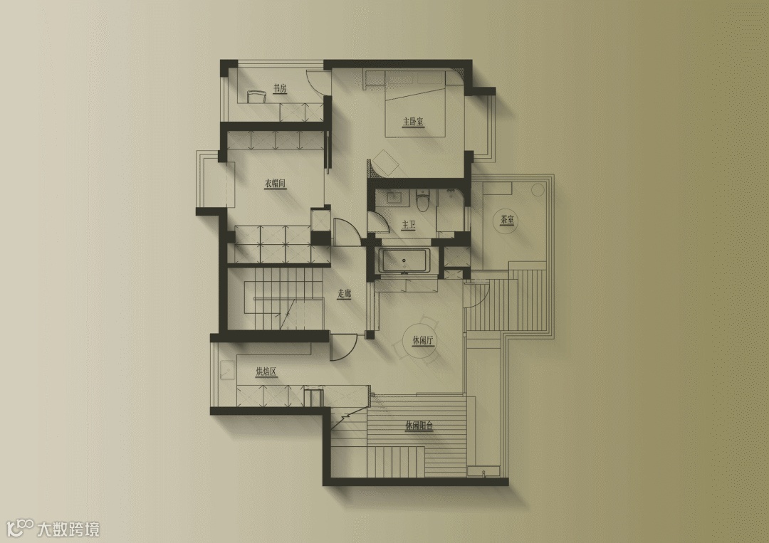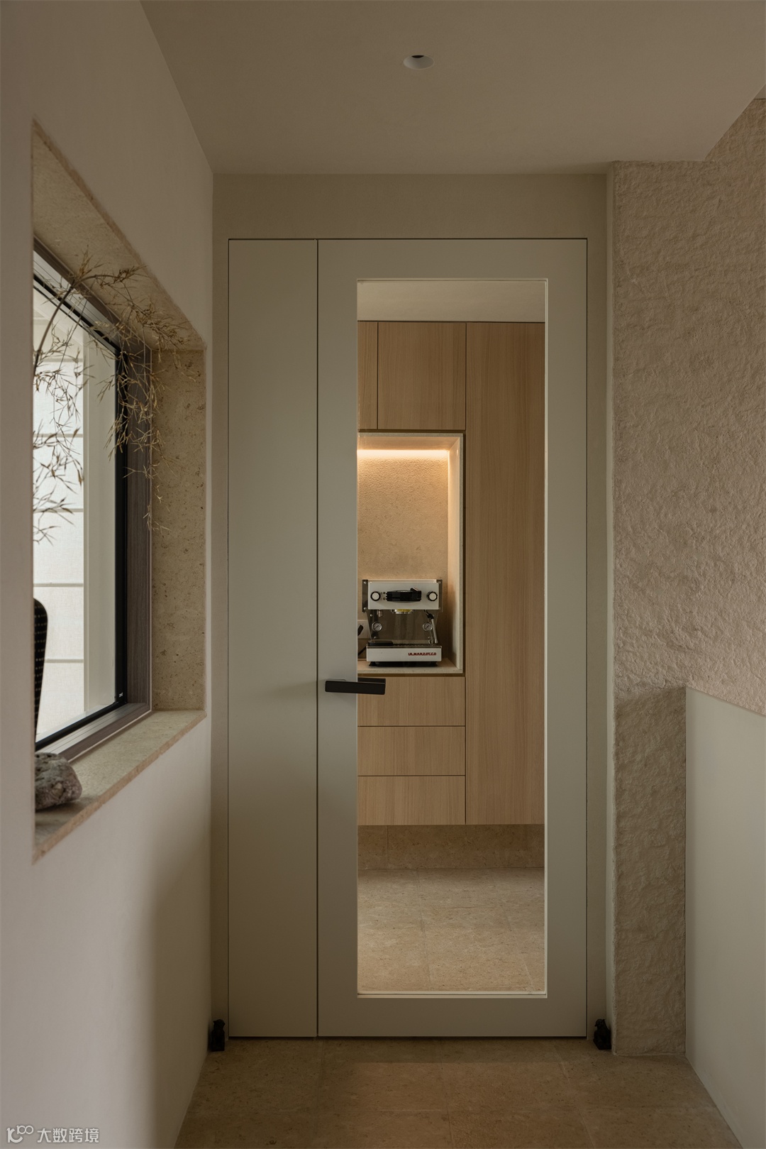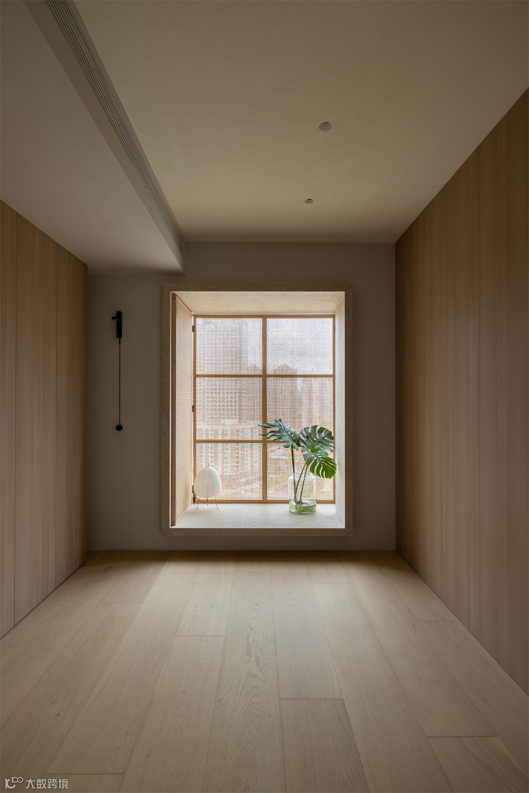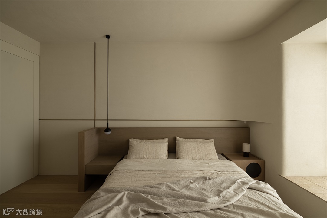 穿过走道便是主卫,旁边以正面是一个半开放式的衣帽间,在有限的空间内将其释放到最大化。自然光进入淋浴区在墙面漫射,再沿着镜面反射,光线曲折之间,增加了空间的层次感和开阔感。