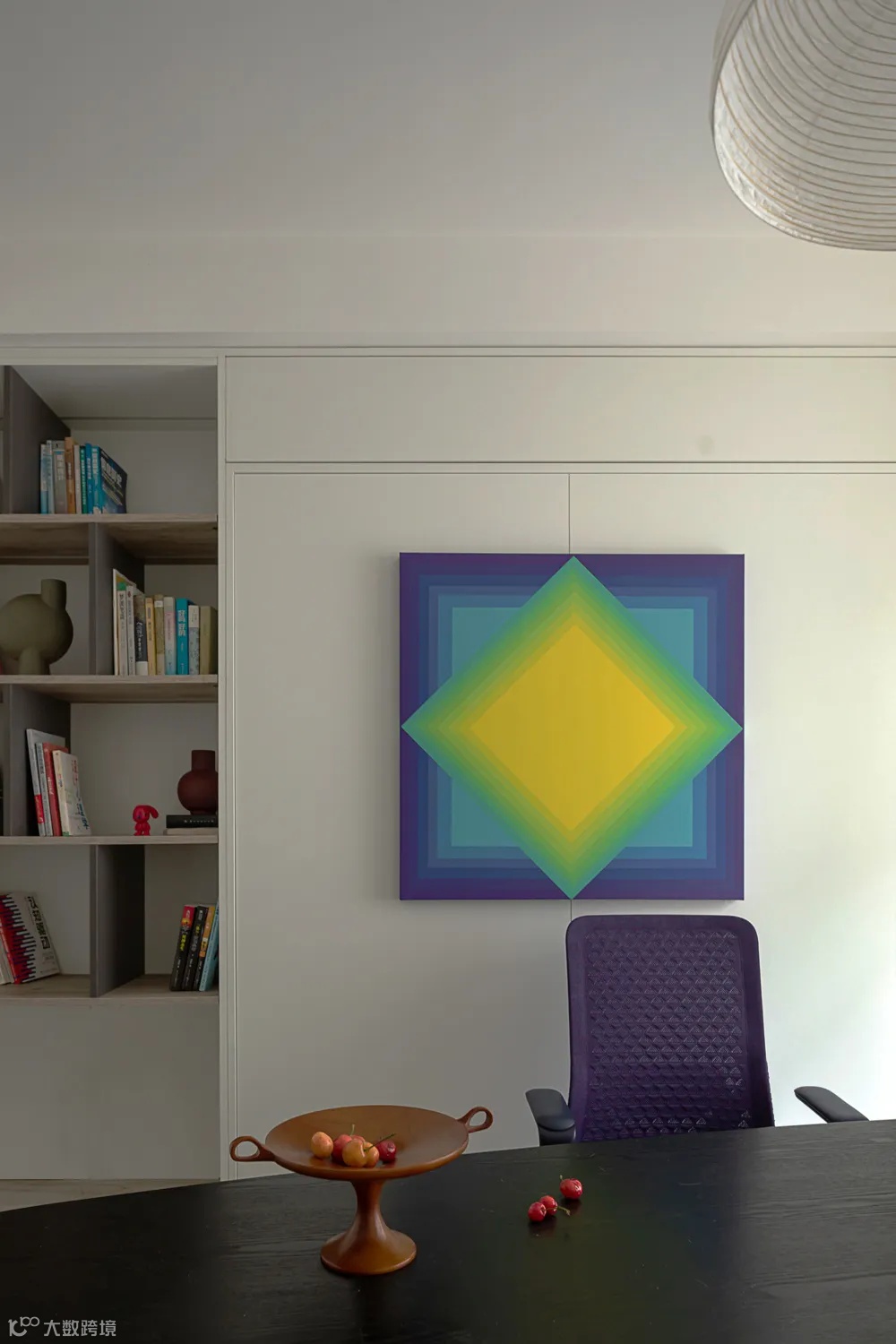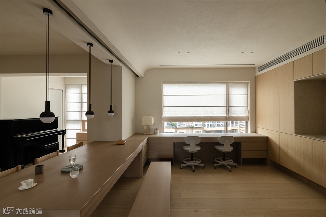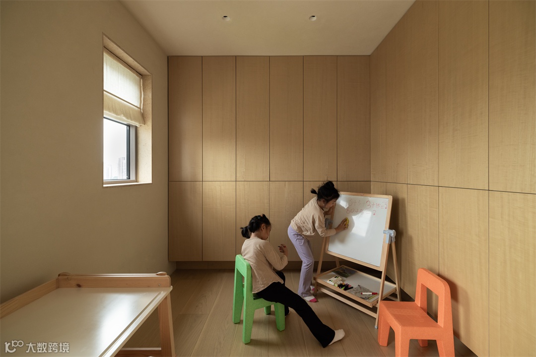居家办公用的书桌,更多时候成为了亲子互动的场所。夫妻俩时常陪着孩子们在此下棋,或者他们在办公,孩子们在一旁画画,偶尔相视一笑,其乐融融,这是设计师之家里每天都会上演的幸福片段。