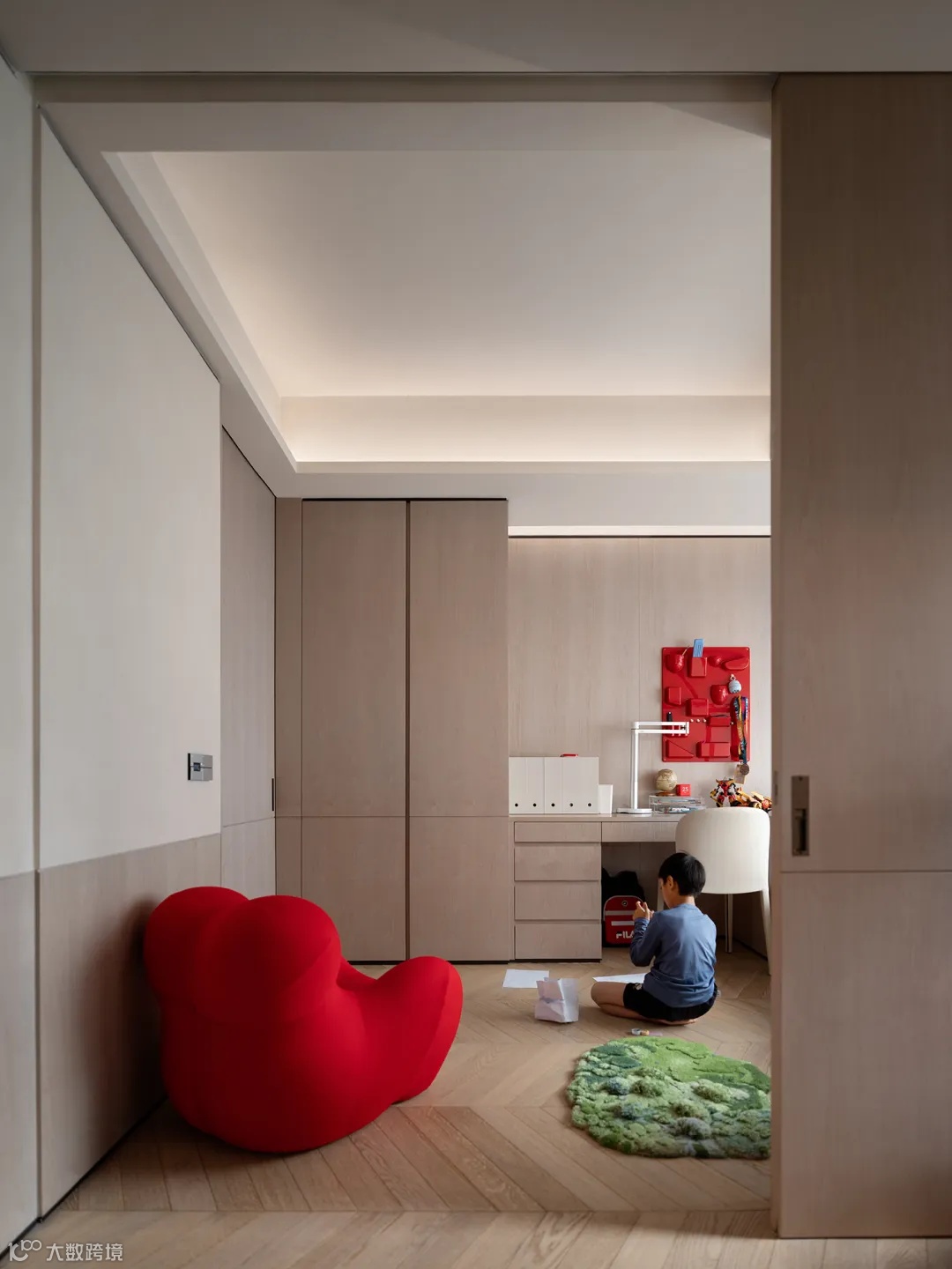 二宝的房间有一个推拉门,有亲朋还有留宿的时候,可以拉下暗藏式下翻床接待。而平时推拉门打开,就是一个敞开的亲子活动室,放着孩子们的架子鼓,愉快且温馨的亲子时光无处不在。