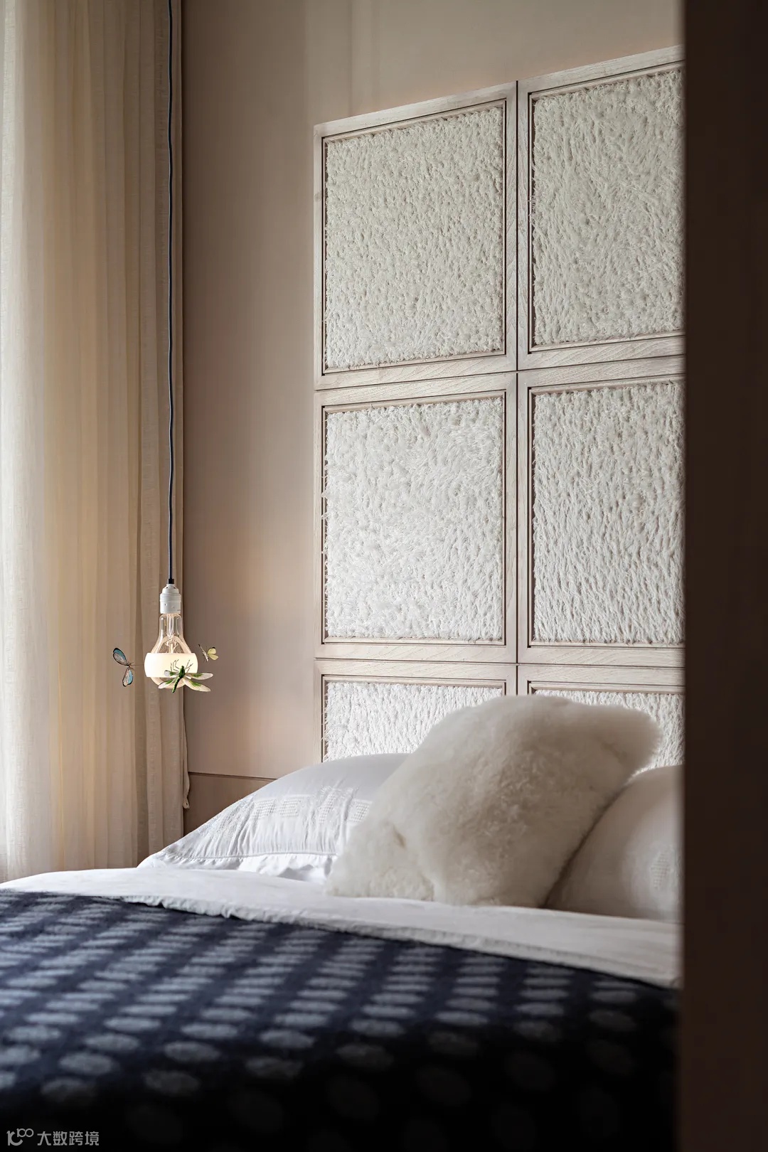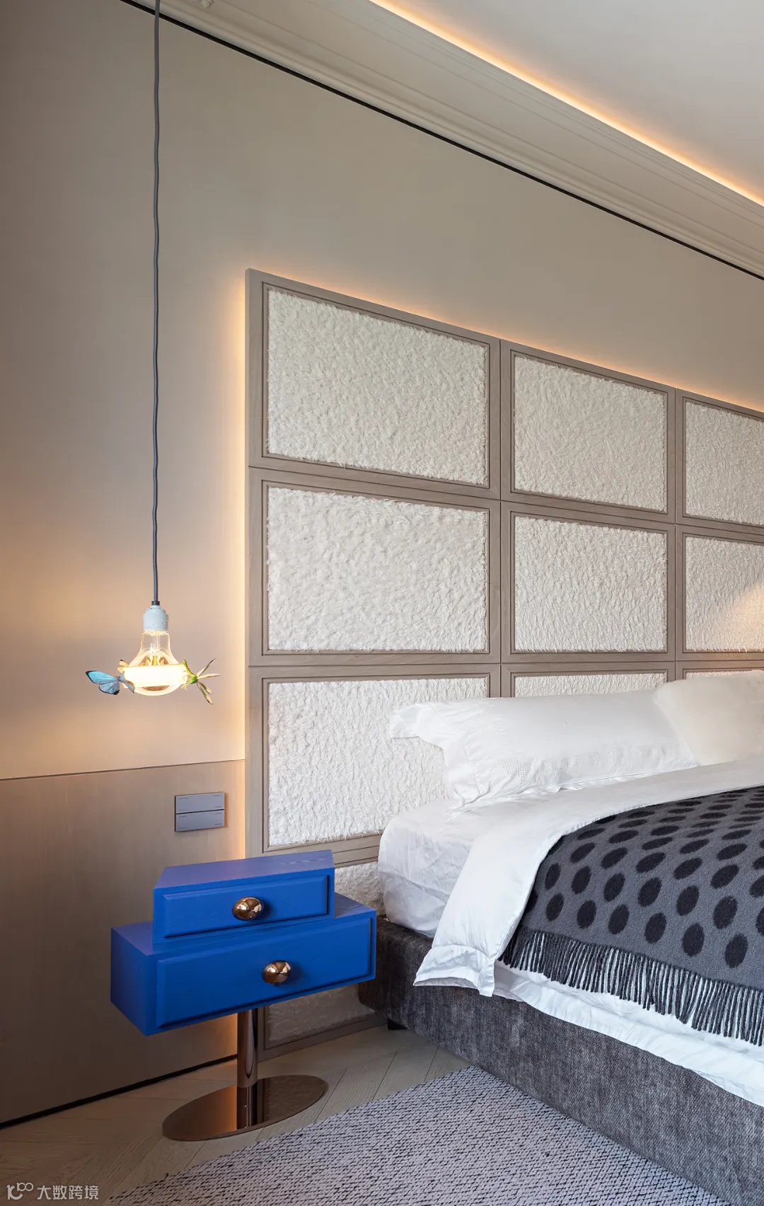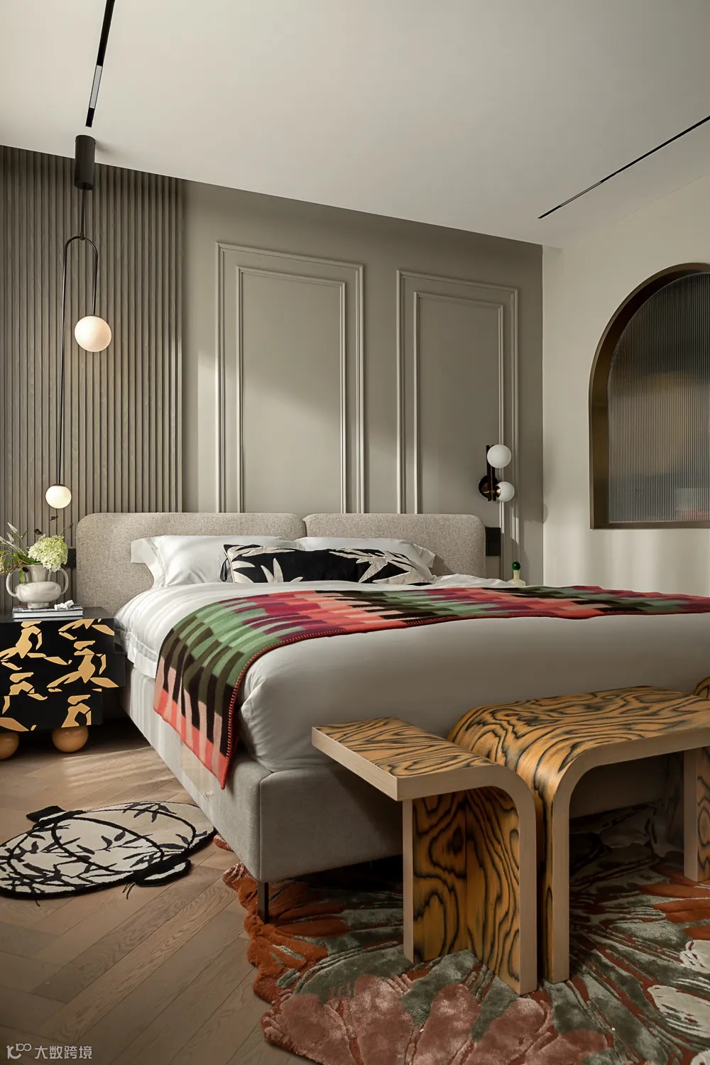 米色是主卧的主色调,就像冬日清晨洒入的阳光,饱和但不刺眼。绒布床头背景以细腻的纹理和质感提升空间的格调、丰富空间的层次。当然,艳丽的色彩点缀也必不可少。