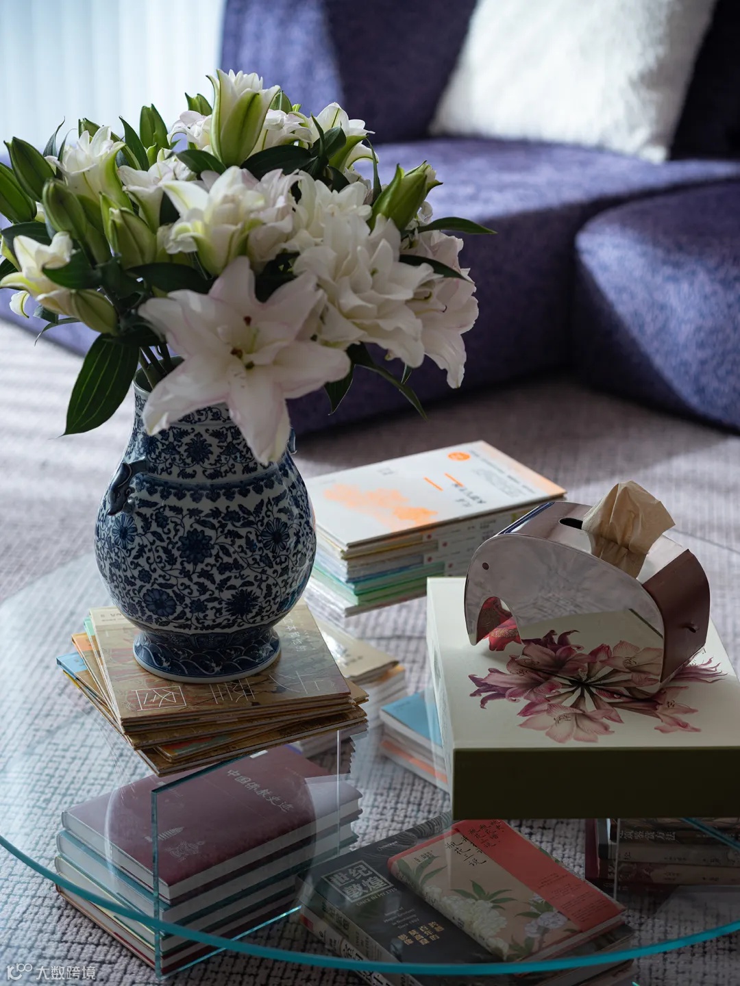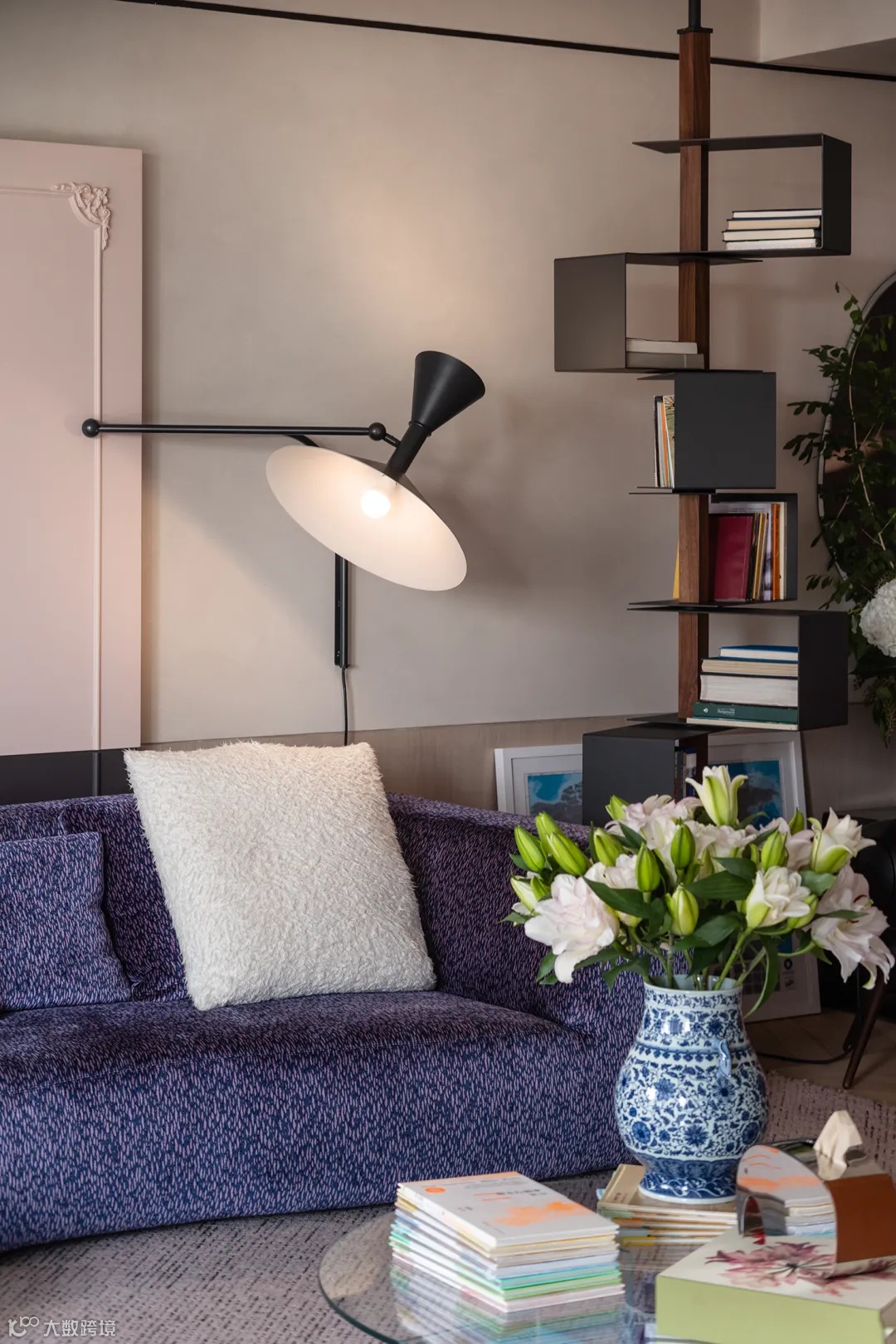 紫罗兰配色沙发高贵典雅,甜美的樱花粉充盈整个花瓣椅,随处可见的绿植调和色彩之间的平衡过渡...设计师徐静将大自然中带来的灵感铺满整个客厅。