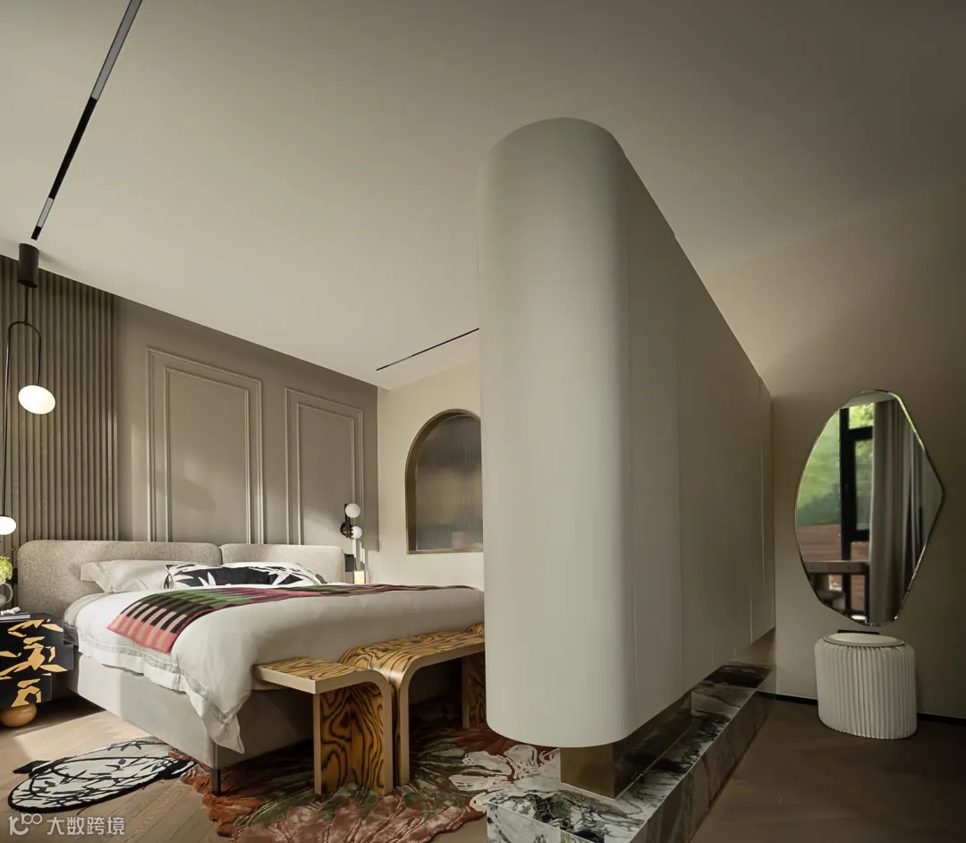 在拆解主卧功能时,发现原有的主卧进深大,主卫采光不足,储物空间缺失。于是如何重构主卧功能是重中之重,改造后的主卧做了内玄关设计,进入主卧,做了一个半拱形门套,门后设计了一个放置隔夜衣的衣帽间,增加了衣帽的分区;卧室内置半高悬浮的天然翡冷翠大理石悬浮柜,内嵌了电视与收纳兼顾,也同时隔出了三米多宽的衣帽间,解决了收纳不足的痛点。