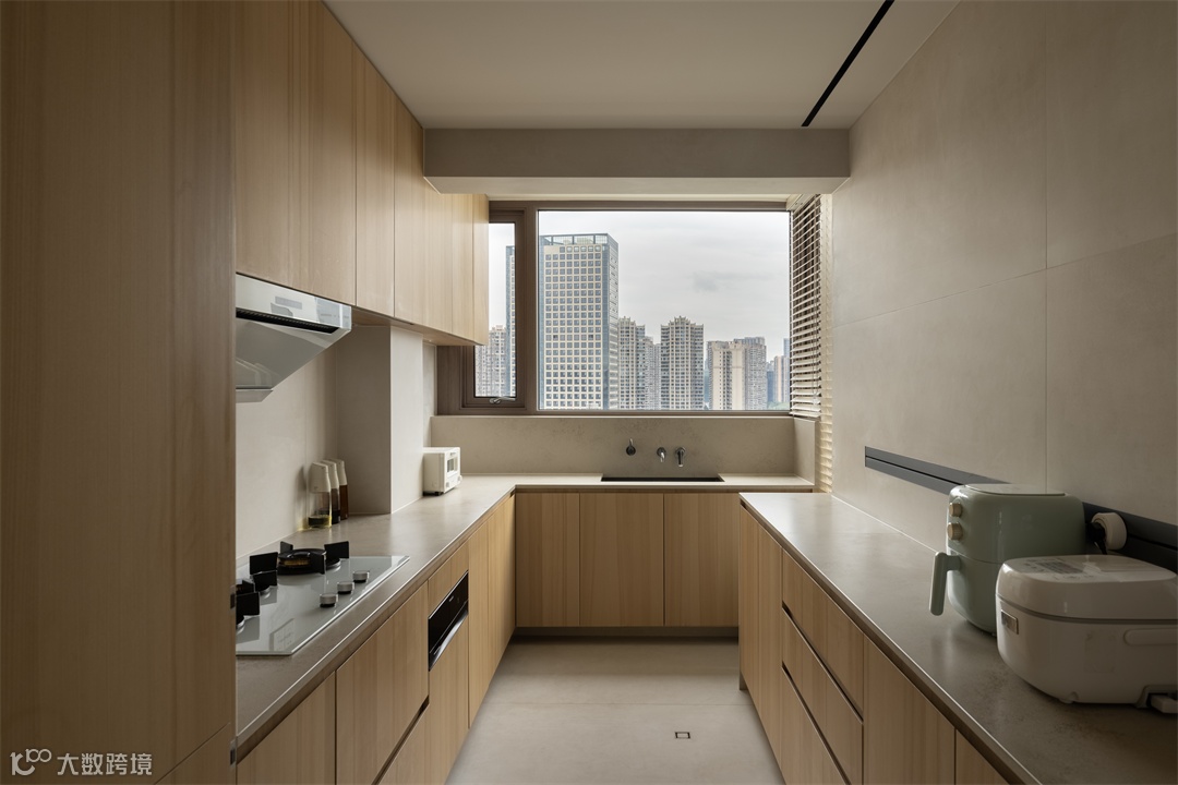 半开放式的厨房,可分可合。橱柜设计充分照顾到拿取的便利性,柜体容量和尺寸都是根据生活需求提前规划,杜绝空间浪费,有时夫妻俩在切水果,孩子们会在旁边搭把手,整个厨房空间充满实用性与互动性。家一定是不断完善人生脉络的地方,它包含着美好的故事和回忆。夫妻俩希望通过设计手法,让每一餐、每一食都充满爱。