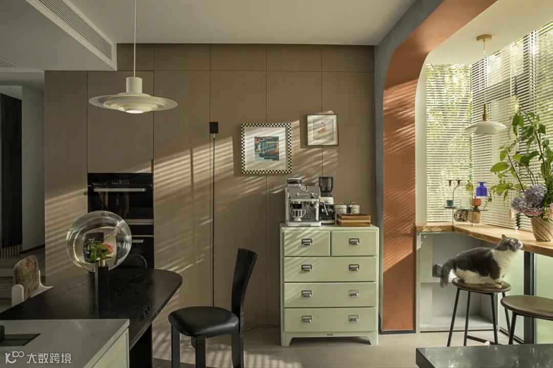 利用保留的柱子设计了开放式岛台,这里便成为了一家人建立互动的情感桥梁,底部做了橱柜收纳,餐桌是活动式的,可与岛台紧密相拥,变成一家人一日三餐的多功能场域,实现了洄游动线的设计,自由畅通的尺度感是Sylvia做空间设计非常看重的一点。