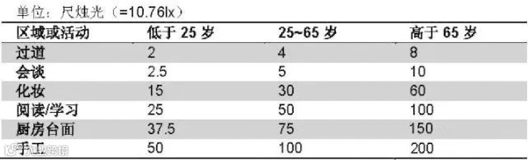 下表显示了推荐的照度水平。每一种应用都有不同的范围:低照度值为25岁以下的年轻人,中间照度值为25- 65岁的人群,高照度值为超过65的老年人。