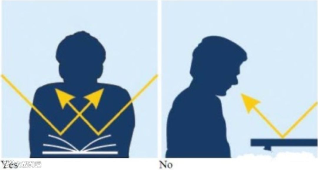 正前方灯光打在桌面上,反射光直接射入人的眼睛,容易产生眩光,两侧的灯光打在桌面上,反射光从余光两侧出去,避免了看书时,书面太亮看不清字体。
