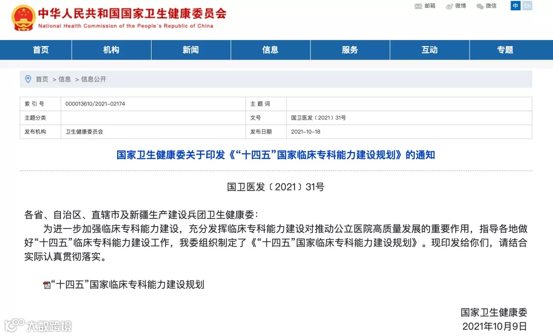 10月18日,国家卫健委印发《“十四五”国家临床专科能力建设规划》。
