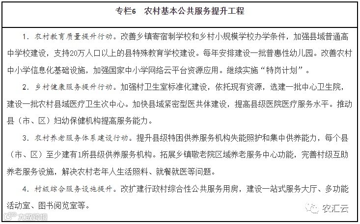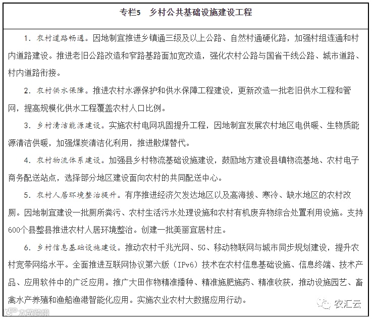 加强乡村信息基础设施建设。实施数字乡村建设工程。加快农村光纤宽带、移动互联网、数字电视网和下一代互联网发展,支持农村及偏远地区信息通信基础设施建设。加快推动遥感卫星数据在农业农村领域中的应用。推动农业生产加工和农村地区水利、公路、电力、物流、环保等基础设施数字化、智能化升级。开发适应“三农”特点的信息终端、技术产品、移动互联网应用软件,构建面向农业农村的综合信息服务体系。