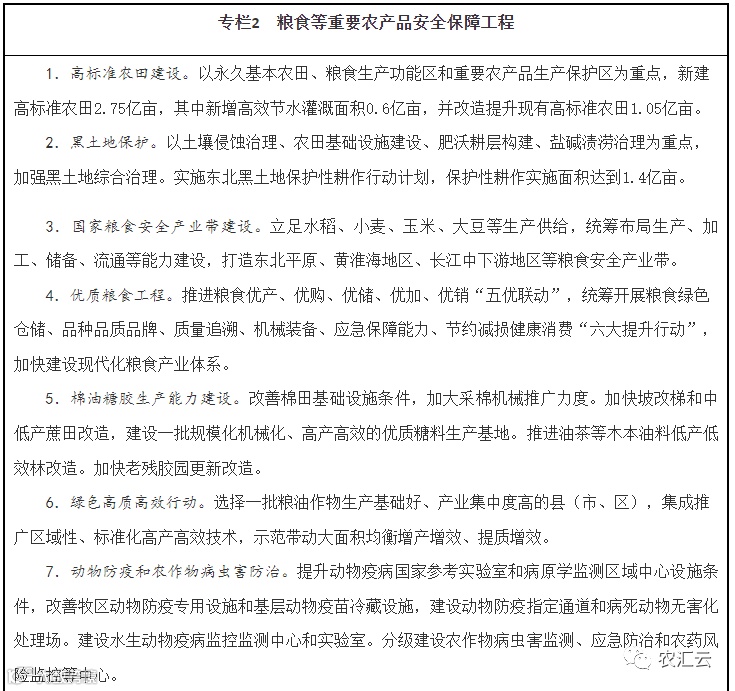 ——粮食等重要农产品供给有效保障。粮食综合生产能力稳步提升,产量保持在1.3万亿斤以上,确保谷物基本自给、口粮绝对安全。生猪产能巩固提升,棉花、油料、糖料和水产品稳定发展,其他重要农产品保持合理自给水平。