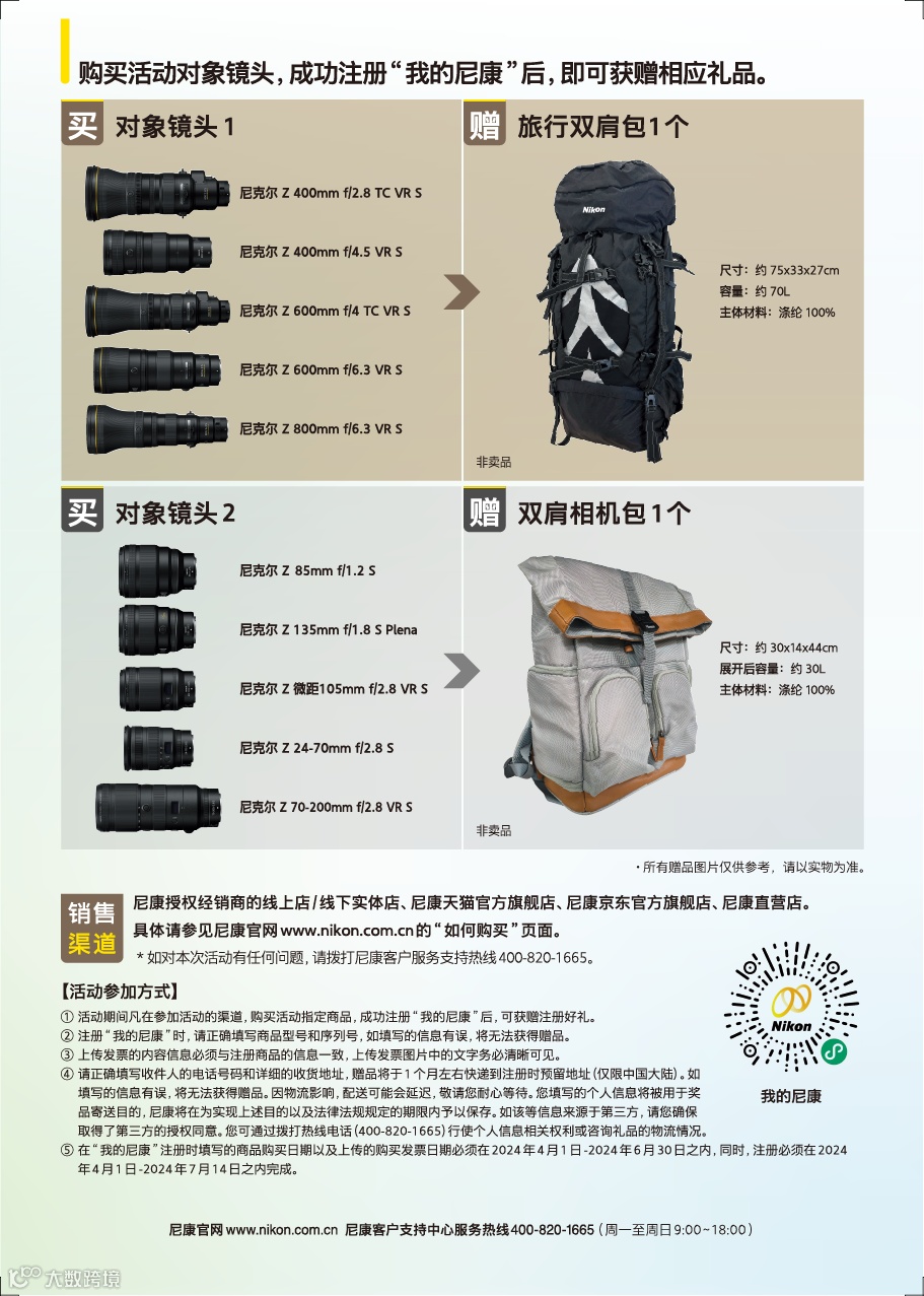 活动期间,凡购买尼克尔 Z 400mm f/4.5 VR S、尼克尔 Z 24-70mm f/2.8 S等十款尼克尔镜头,并成功完成【我的尼康】注册的用户,即可获赠尼康好礼一份。