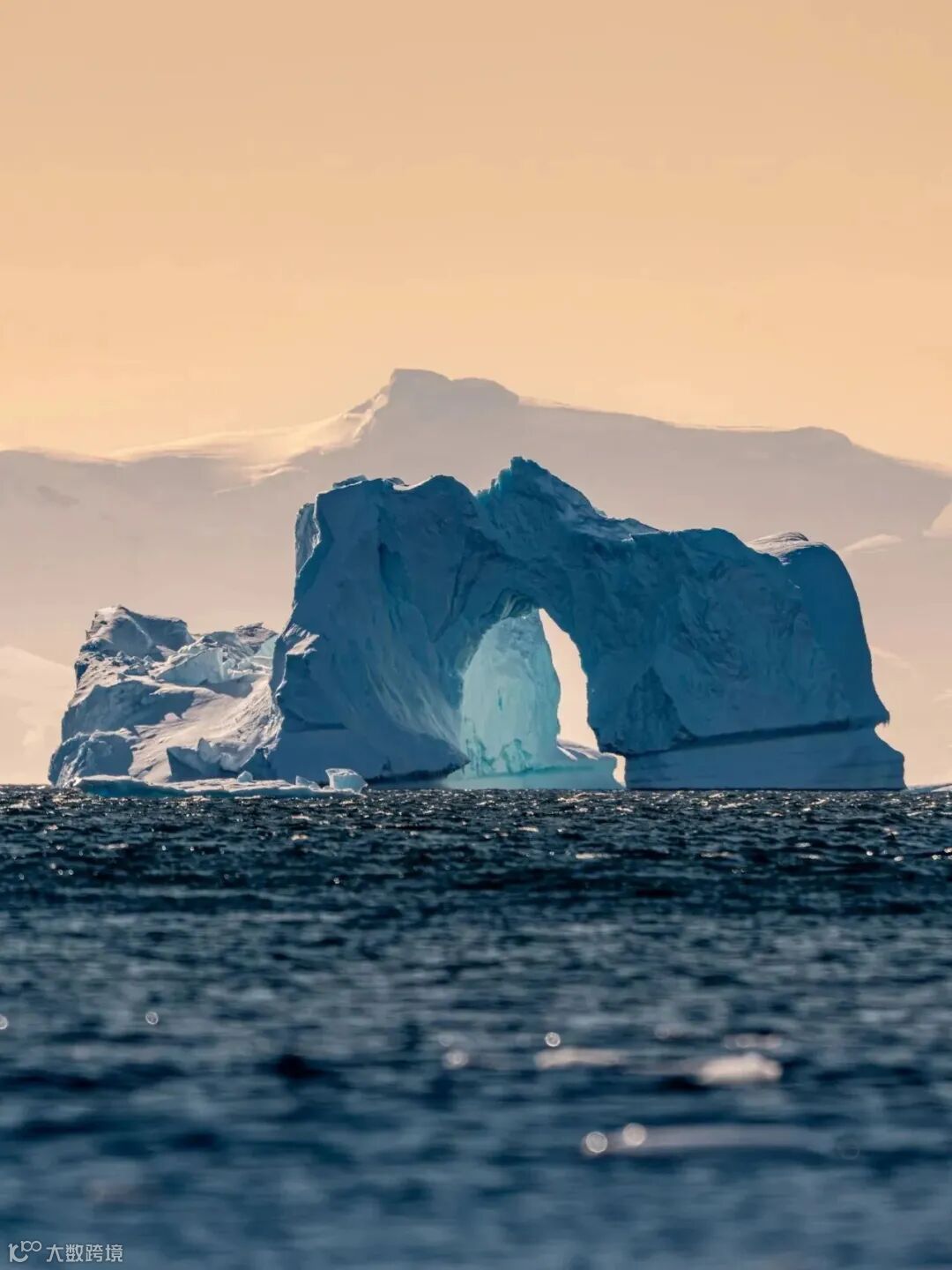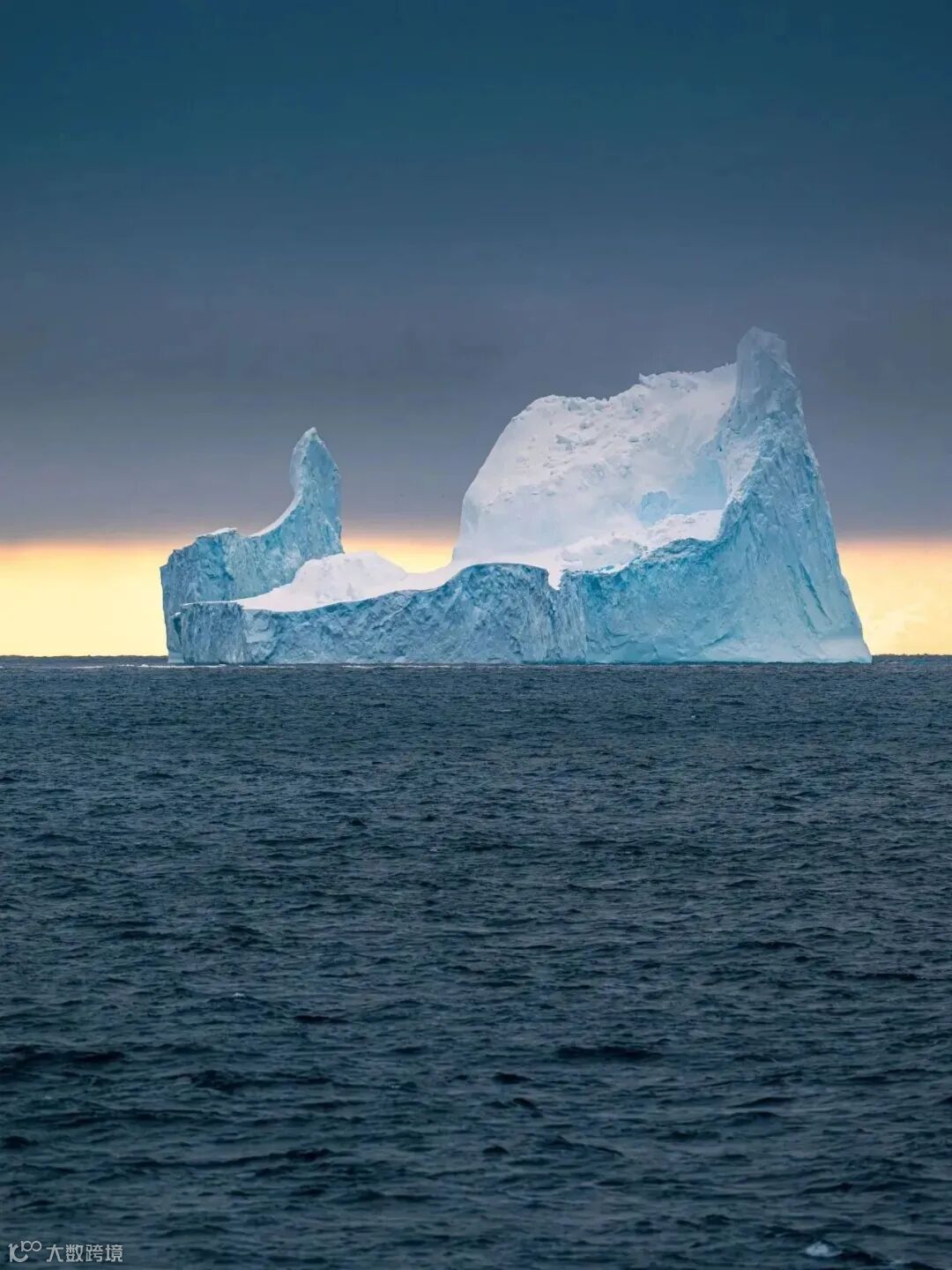 出海去探索不同地貌,刚出发就看到远处漂浮着一个外形酷似西藏圣象天门的超大冰川:在蓝色的冰川与夕阳余晖的对比下,这种冷暖色调的融合格外让人着迷,也更具神秘感。为了让整张照片的氛围更有冲击力、让观看者更有身临其境感,我选用600mm焦段进行拍摄,通过长焦端的空间压缩搭配低角度海平面前景构图,来让画面更有层次感,前景、中景、远景层次分明,轮廓清晰可见。