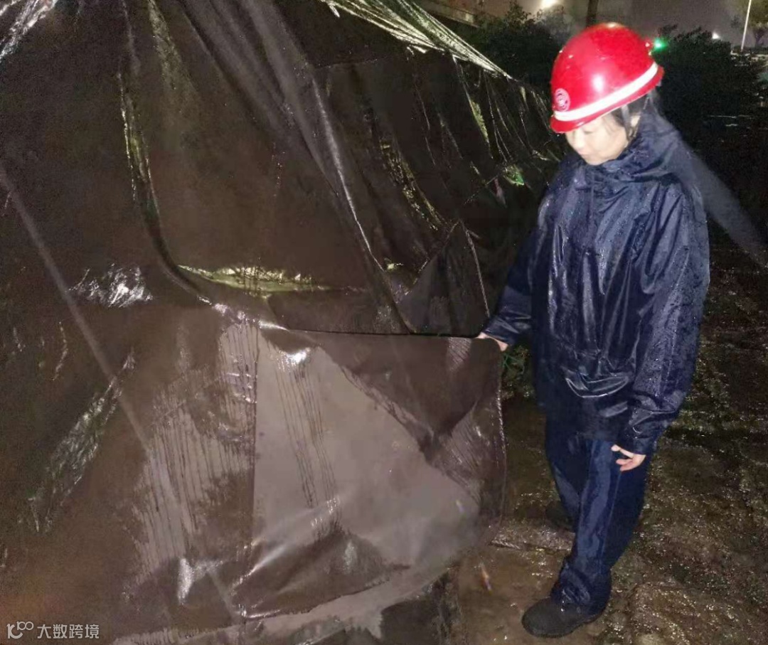 19时左右,静默的对讲机突然响起“309场25#垛货垛顶上篷布疑似被高架上吹落得杂物砸破一个洞,要抓紧加盖新篷布。”程红在对讲机中喊道。随后,其顶着大风雨水天气坚守现场,直至现场完全将该货垛重新加盖一块篷布后才继续前往下一个地点进行继续巡查。回到理保室后,脱下雨衣的她,工作服虽然没有被雨水淋湿,却早已被汗水浸湿。