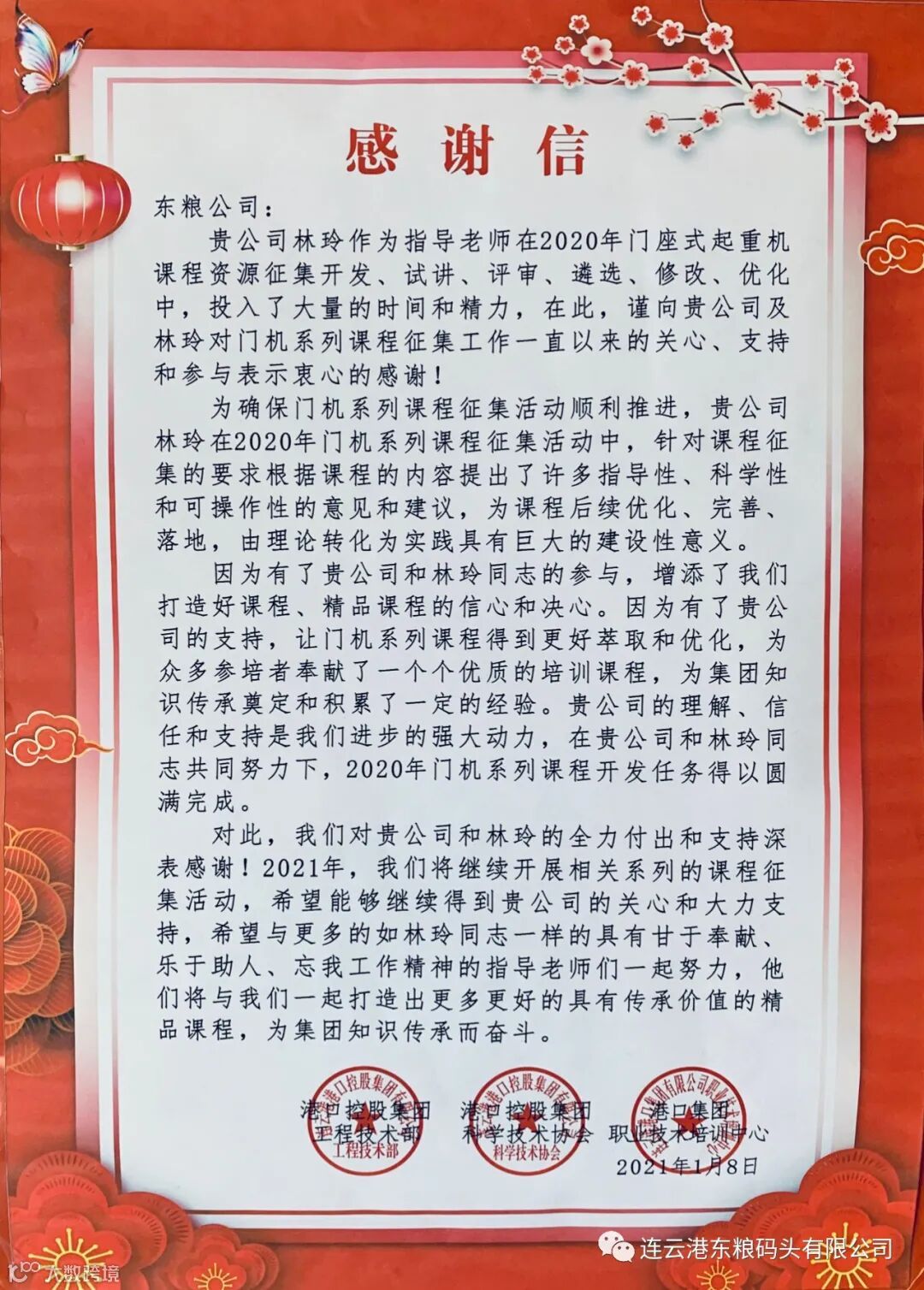 近日,东粮公司收到一封由集团工程技术部、科技协会、职业技术培训中心联合发起的感谢信,信中对东粮导师林玲为开发门机系列课程做出的贡献表示感谢。