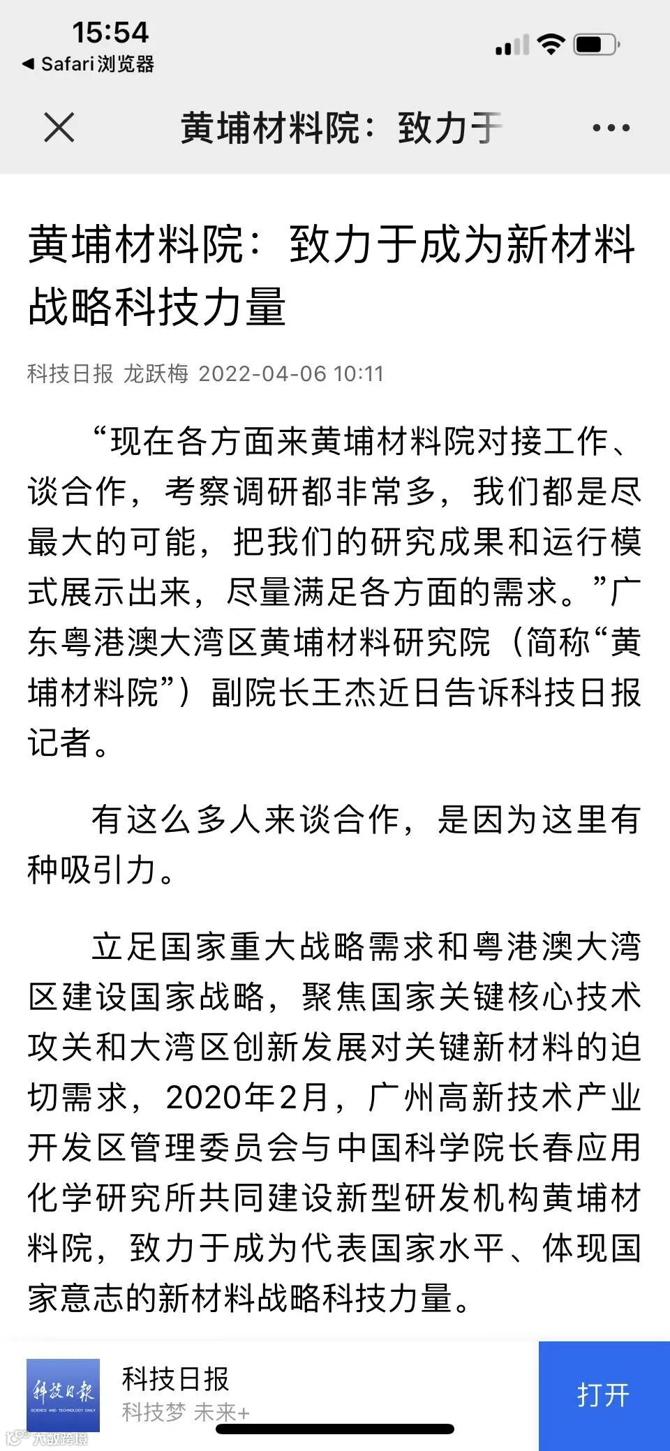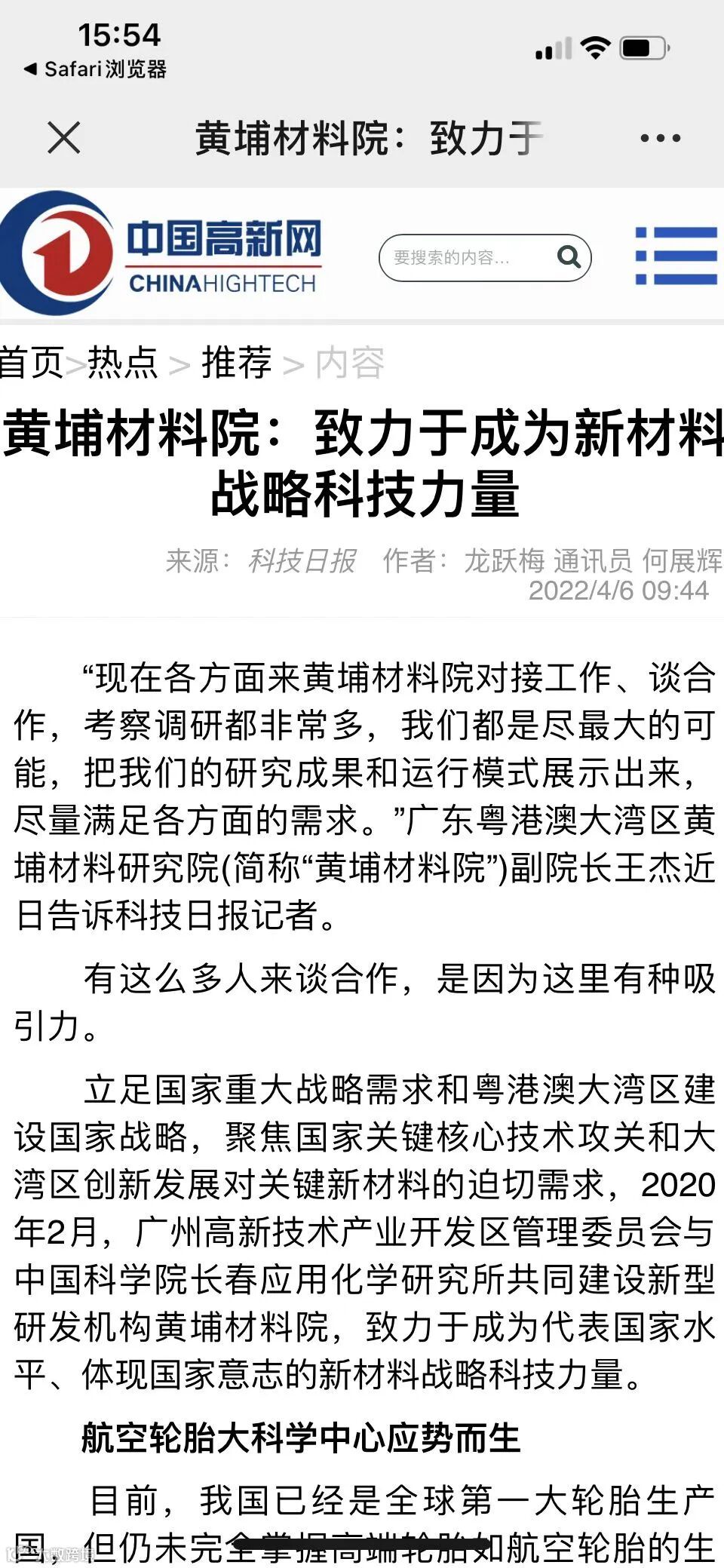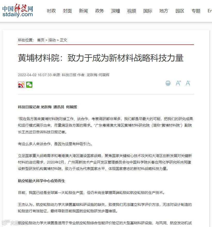 日前,科技日报社广东记者站站长龙跃梅来我院实地调研采风后,于4月2日在其官方网站——中国科技网,发表了题为《黄埔材料院:致力于成为新材料战略科技力量》的文章,学习强国等平台、网站给予了全文转载。