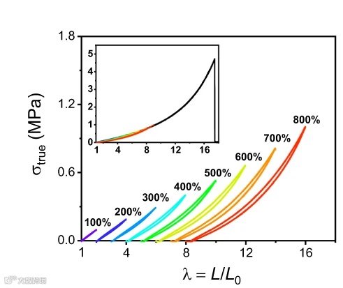 图2-a 不同应变下PAA/甜菜碱弹性体的循环应力-应变曲线。插图是拉伸曲线发生断裂的应力-应变曲线