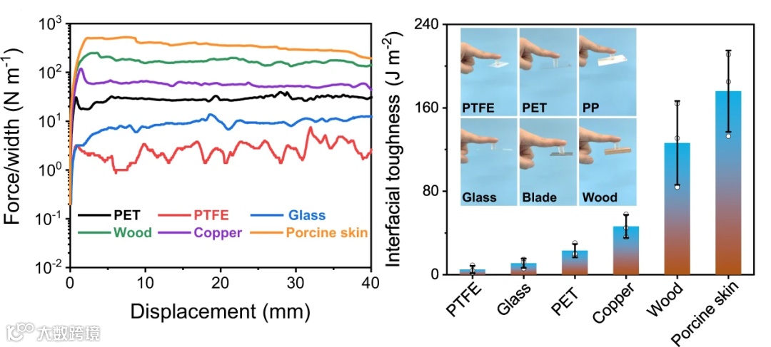 图2-e PAA/甜菜碱弹性体和不同基底(聚四氟乙烯、玻璃、PET树脂、铜、木材、猪皮)的90°剥离曲线(左边)和相应的界面强度(右边)