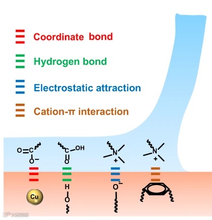 图2-f 吸附粘结力图解(配位作用、氢键作用、电荷相互作用、阳离子-Π作用)