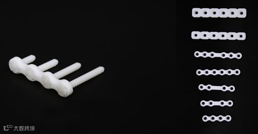 医用可吸收材料的另外一个重要应用是制作正骨材料如骨钉、骨板等。传统的骨折处理方法是用钢钉或者钢制螺丝穿过碎裂的骨头或者用钢板夹持骨折部分以达到定位的作用,这种方法不仅需要进行二次手术取出,还会在骨头上留下钢钉穿孔,存在潜在的隐患。医用可吸收材料制备的骨钉、骨板等材料植入人体后其固有的初始强度完全可以满足使用条件,起到正骨的作用。随着时间推移,骨头受损部分逐渐愈合至彻底康复,同时正骨材料也进行生物降解逐渐被人体吸收,免除了病人二次手术的痛苦,同时吸收部位也会被体内组织填满,没有孔洞的形成。