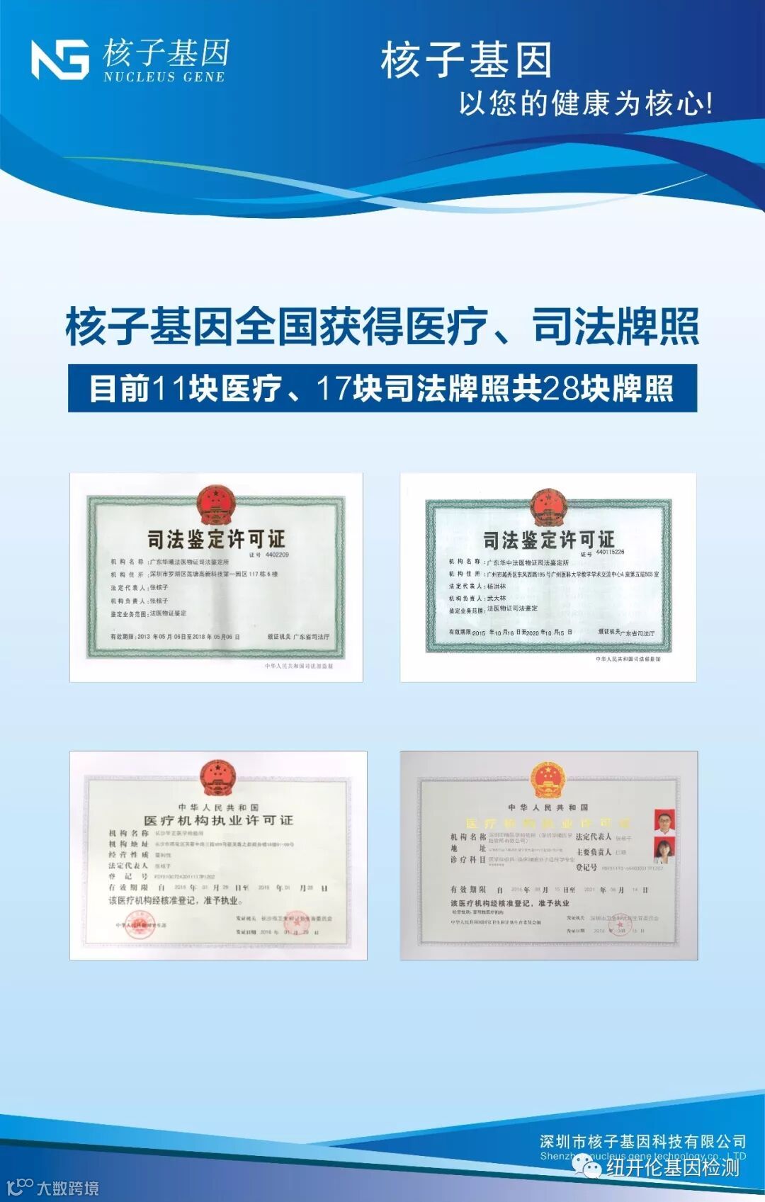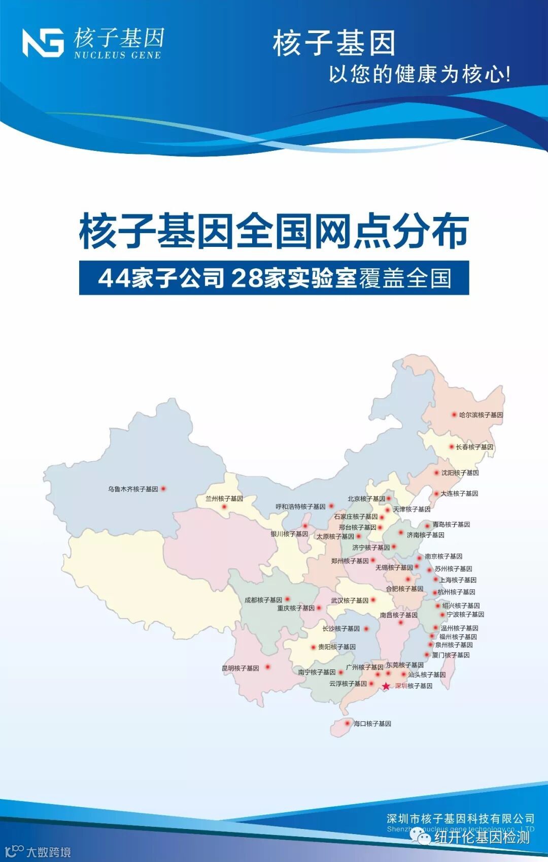 深圳市核子基因科技有限公司成立4年时间内,在深圳、广州、北京、哈尔滨、长春、沈阳、济南、西安、上海、杭州、武汉、长沙、重庆、成都、贵阳、昆明、南宁、海口等全国大中城市设有44家子公司和29个标准化实验室,检测服务已经覆盖全国。所以检测结果的合法性和有效性大家就不用怀疑了。