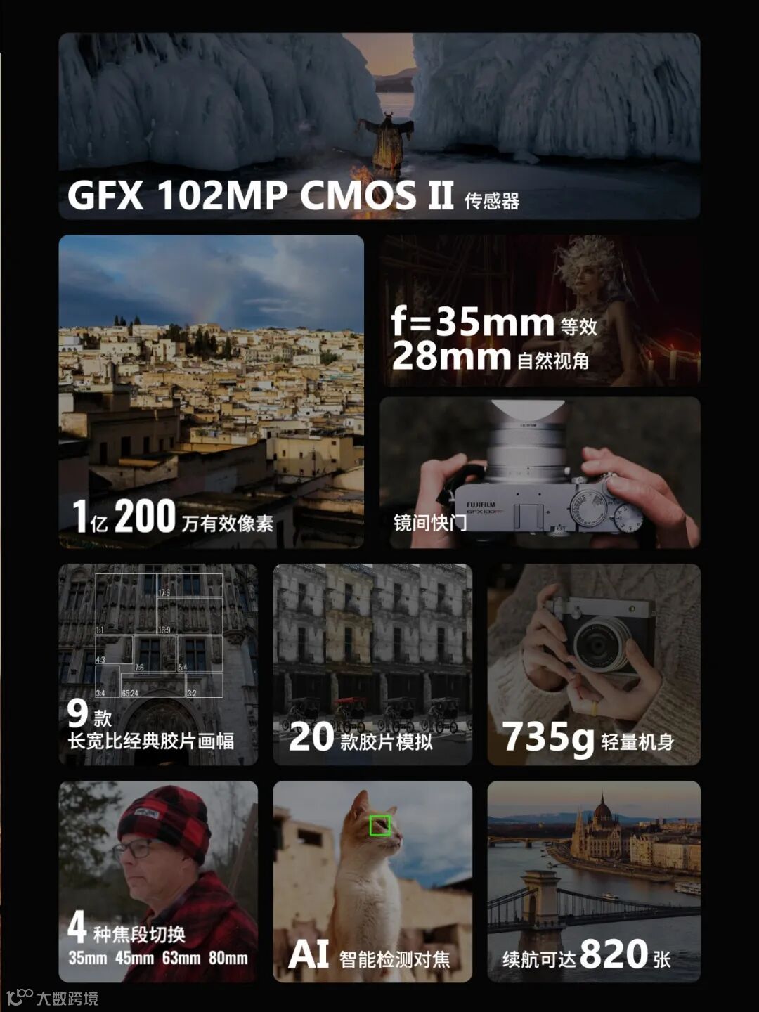 FUJIFILM GFX100RF ——GFX系列首款固定镜头一体化中画幅数码相机,以仅约735克的机身重量,将1亿200万像素的中画幅影像力量置于掌中。传感器面积约为全画幅的1.7倍,每一个画面都是对细节的礼赞与致敬。