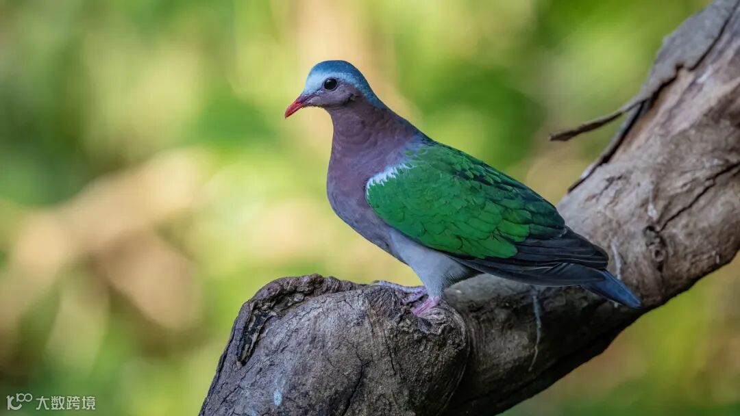 这是一只绿翅金鸠,它静静地站在那儿,身姿优雅而挺拔。它的羽毛在阳光下熠熠生辉,犹如被镀上了一层金色的光泽,令人忍不住想要靠近,去细细欣赏它的美丽。