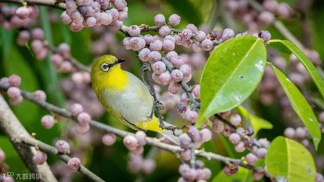 一只灰腹绣眼鸟身姿轻盈,正忙碌地在树枝与果实之间穿梭觅食。它的羽毛呈现出淡雅的黄色,腹部则是一片柔和的灰色,仿佛是大自然精心调配的色彩,既低调又不失优雅。灰腹绣眼鸟在树枝间跳跃,灵活敏捷,轻盈自如。