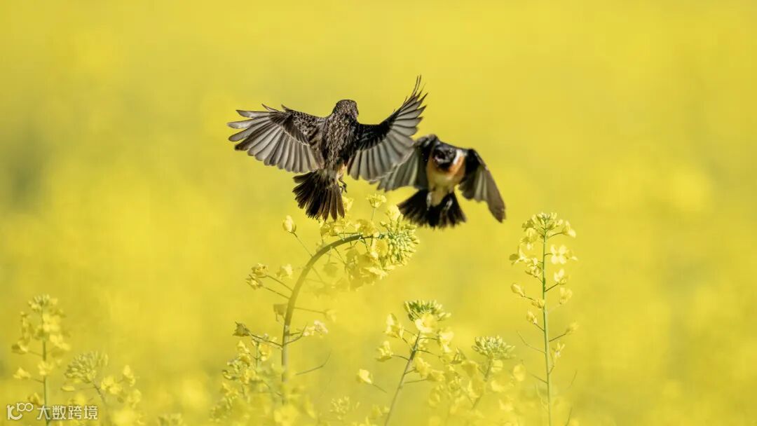 在春日的暖阳下,油菜花田金黄一片,宛如一片金色的海洋,微风拂过,花海泛起层层波澜。此刻,两只黑喉石鵖突然闯入了这片宁静的田园,它们的羽毛在阳光下闪烁着光泽,身影在花海中忽隐忽现,每一次振翅、每一次俯冲都充满了力量与速度。它们时而盘旋在空中,时而俯冲向地面,每一次的交锋都让人屏息以待。