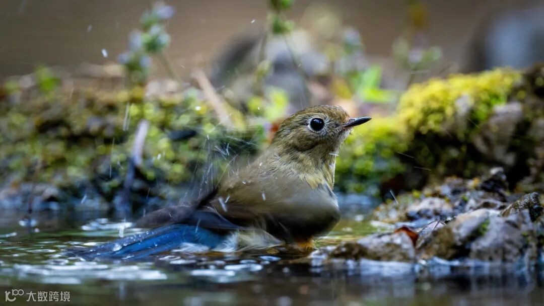 一只红胁蓝尾鸲雌鸟此刻正专注地抖落羽毛上的水珠。水珠晶莹剔透,随着它的动作轻轻滑落,闪烁着微弱的光芒,仿佛是大自然赋予它的独特装饰。它的羽毛呈现出一种深邃的蓝色,使得它看起来优雅而迷人。